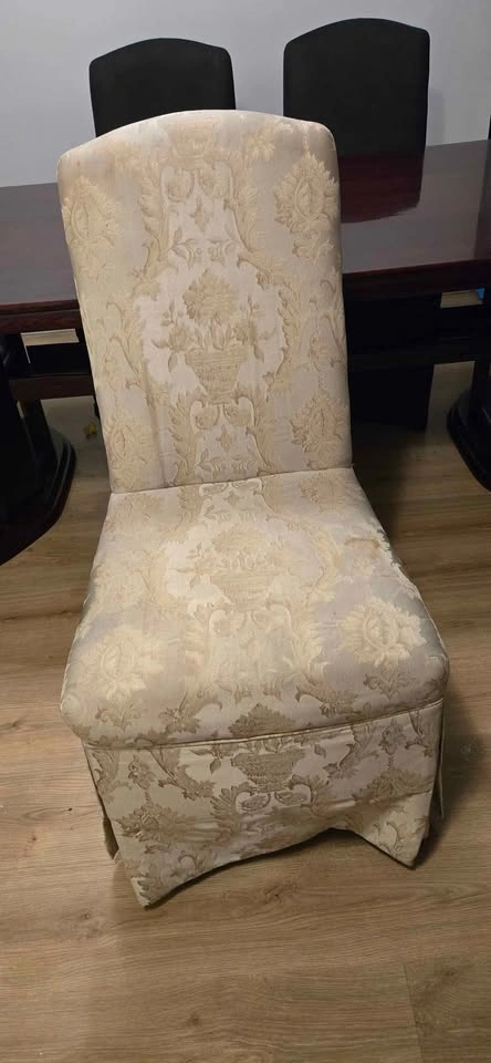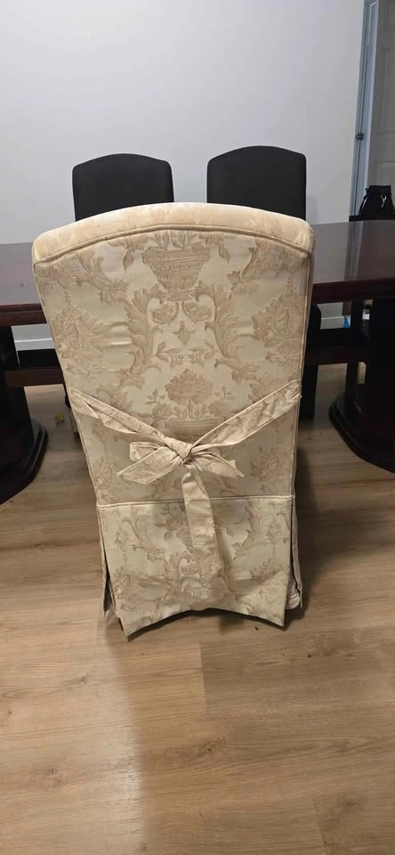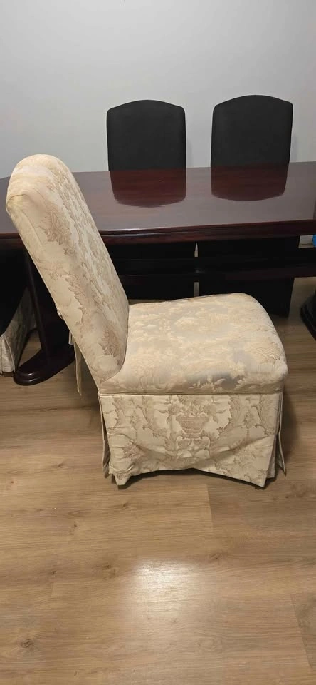 This is a 6'7" (length) 3'3.5"(width) dining room table (with shelf space under table) that comes with six 2007 Thomasville Dining chairs. All chairs have seat covers on them. All chairs are kind of an Ivory White color underneath the seat covers. Pictures of the different angles of the table and chairs are at the top of this ad.