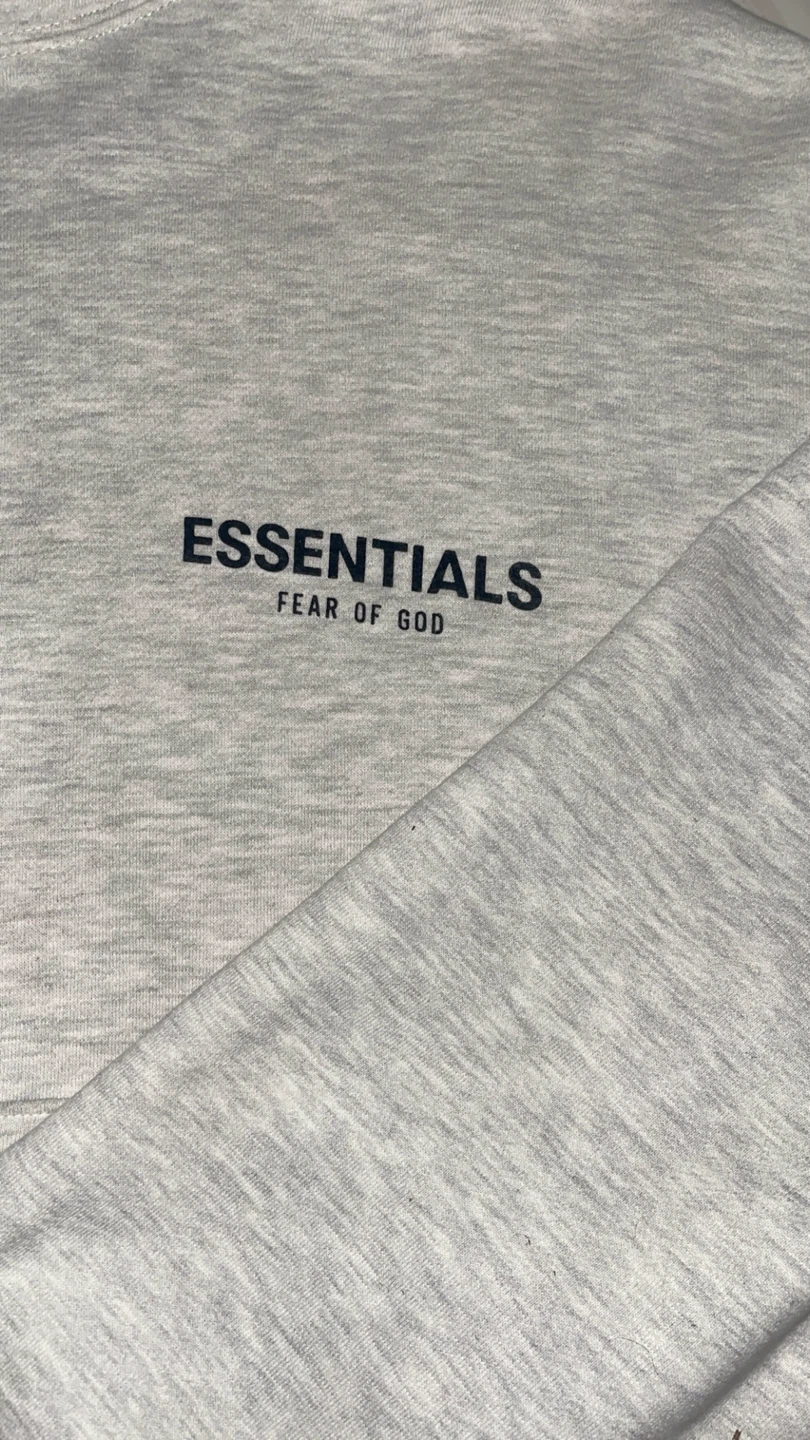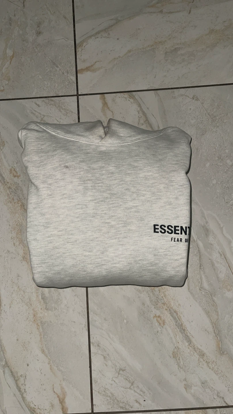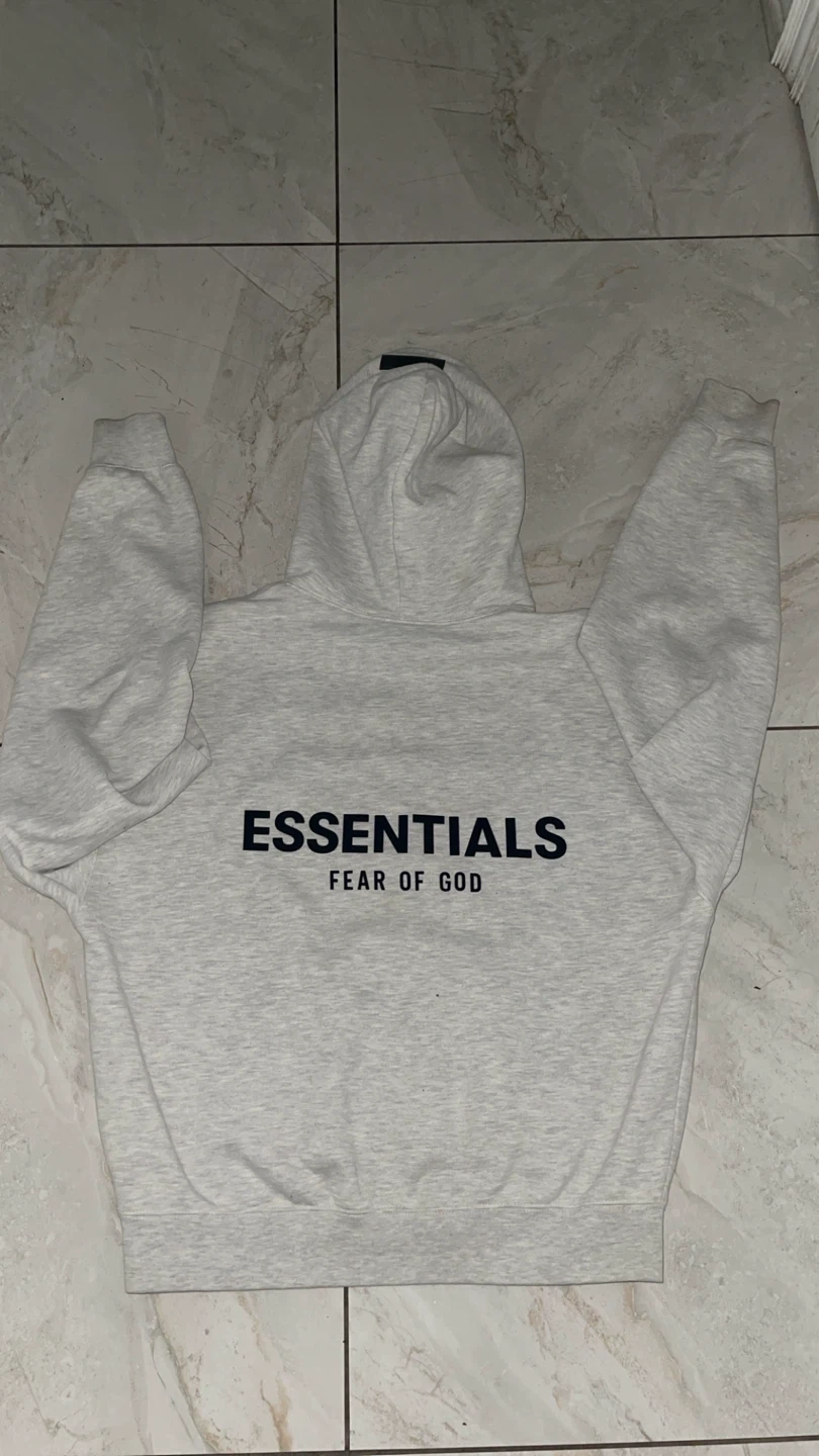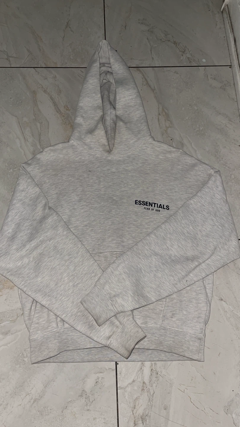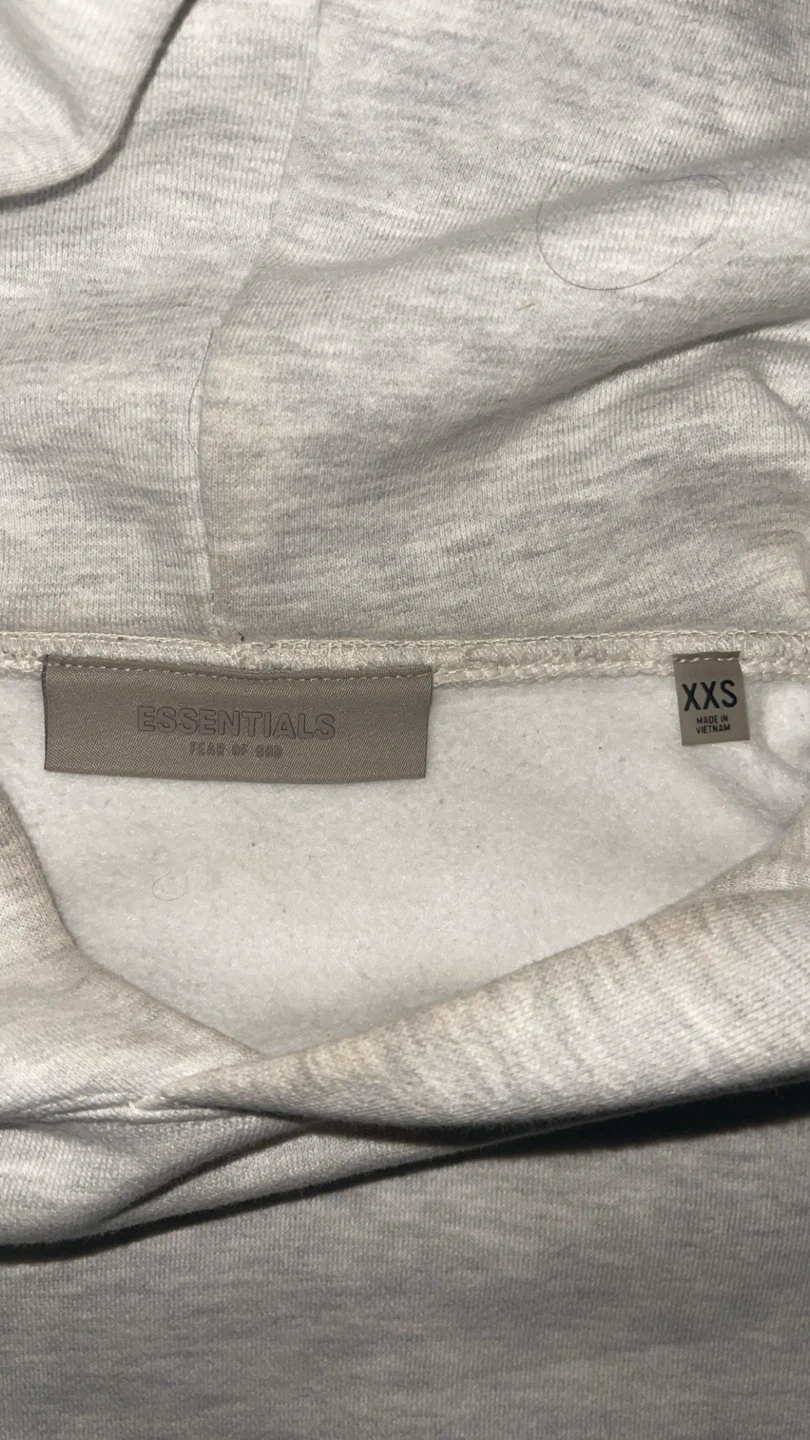 25Selling an Essentials Fear of God hoodie in size XXS. It's a light grey colour and has the brand name printed on the front and back. Great for casual wear!
