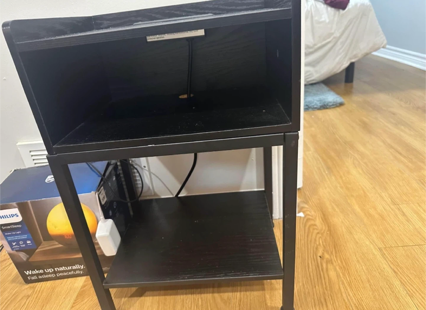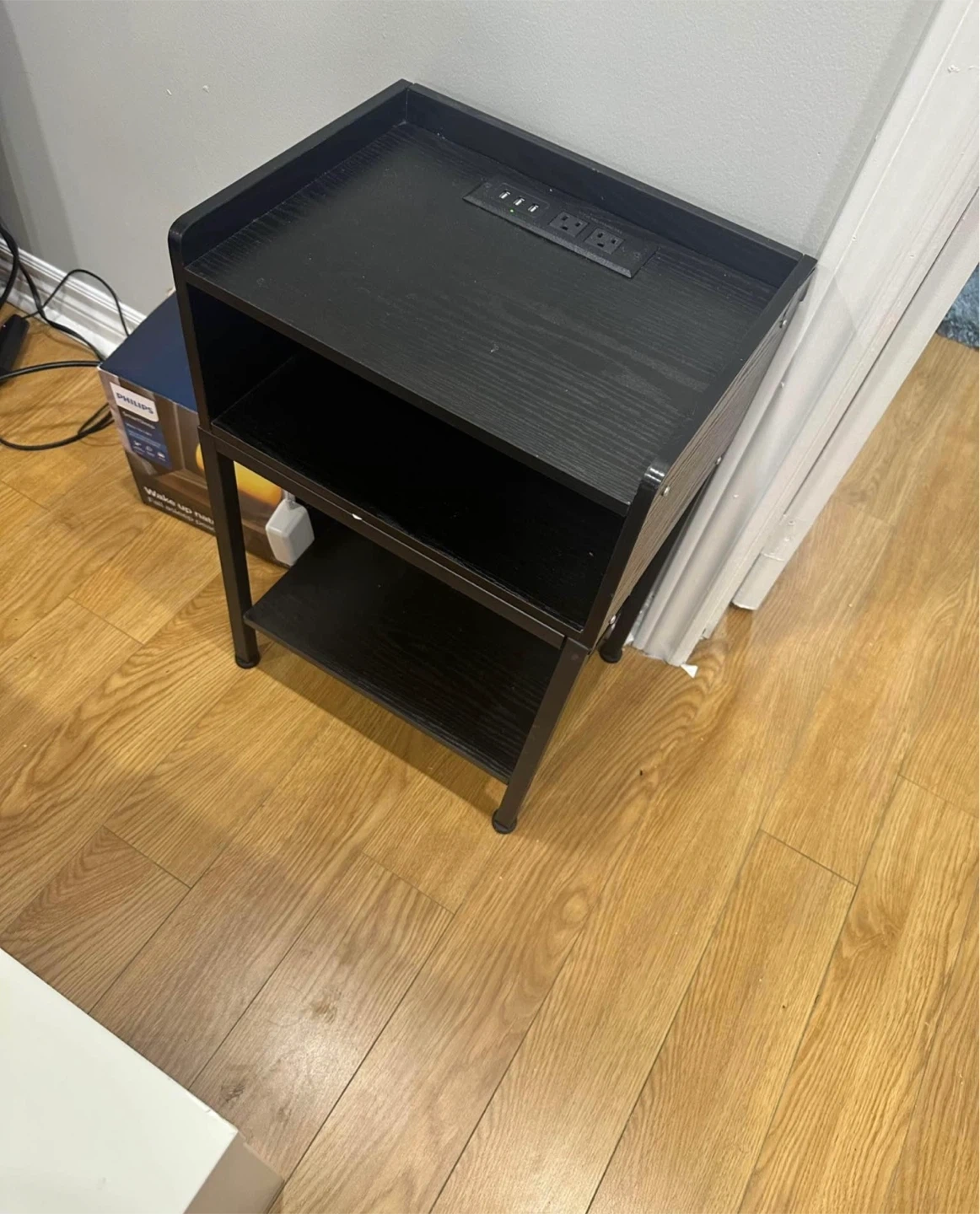 Selling a handy black end table! It's got a built-in power strip with USB ports, so it's perfect for charging your devices. Plus, it has two shelves for extra storage. Great for beside the bed or next to the couch