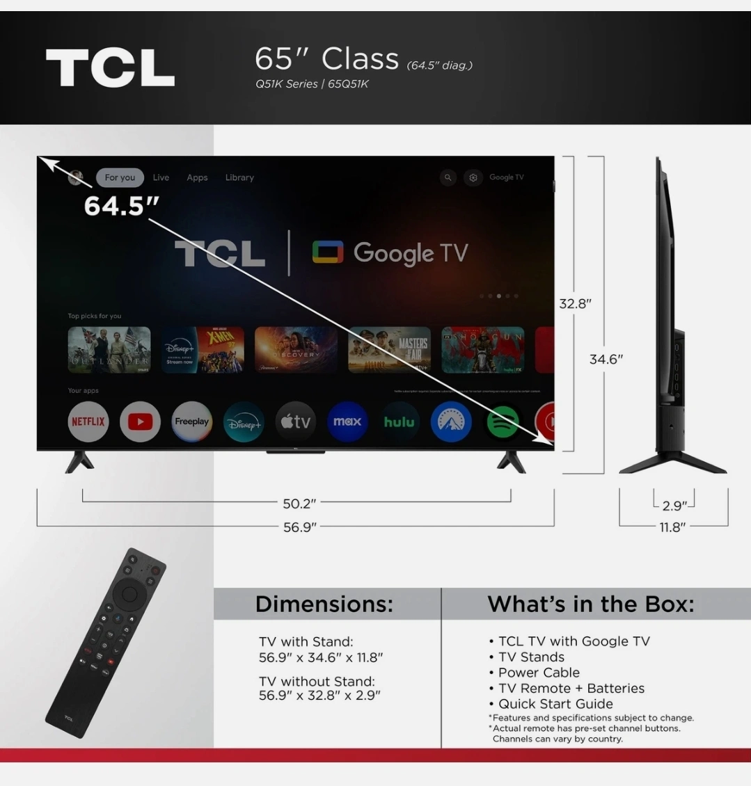 65TCL 65" Q51K Series (NEW 2025) 4K UHD HDR PRO+ QLED Smart Google TV (65Q51K) 4K UltraHD Resolution - Experience incredible detail with 4X the resolution of 1080p Full HDTVs. QLED – Quantum Dot Technology - Rich, vibrant colors bringing images to life. TCL AIPQ Processor - Powerful, advanced processor intelligently optimizes the color, contrast, and clarity for an unrivaled 4K HDR experience. High Brightness LED Backlight (43”-75”) - Q51K models produce brighter images for enhanced viewing experience for all your favorite games, sports, movies, and TV shows. HDR PRO+ with Dolby Vision, HDR10+, HDR10, & HLG - Enjoy enhanced contrast, accurate colors and fine details utilizing all the most advanced HDR formats. Auto Game Mode (ALLM) - Automatically enables game mode for the lowest possible input lag and latency for an unmatched gaming performance. Dolby Atmos Audio - Advanced spatial audio processing can be found in movies, TV shows, and video games. DTS:X and DTS Virtual:X - Advanced audio processing and post-processing for your everyday content offering an immersive 3D sound, all from just your TV speakers. Bluetooth Personal Audio - Pair your favorite Bluetooth headphones to the TV for a private listening experience. FullView Metal Bezel-less Design - Elegant edge-to-edge glass design, sleek back panel. 3 HDMI Inputs including one with eARC (4 HDMI on 98”) - Three high-speed HDMI inputs for the best connection to gaming consoles, set-top boxes, AV receiver, and more. Wi-Fi 5 - Fast Wi-Fi performance for your high-speed internet connection Google TV Smart OS with Voice Remote - The entertainment you love. Google TV brings your favorite movies, shows, and live shows together. Google Chromecast Built-in - Works with the streaming apps you know and love: Enjoy TV shows, movies, videos, songs, games, sports and more from thousands of apps. NEW with WARRANTY EASY FINANCING AVAILABLE