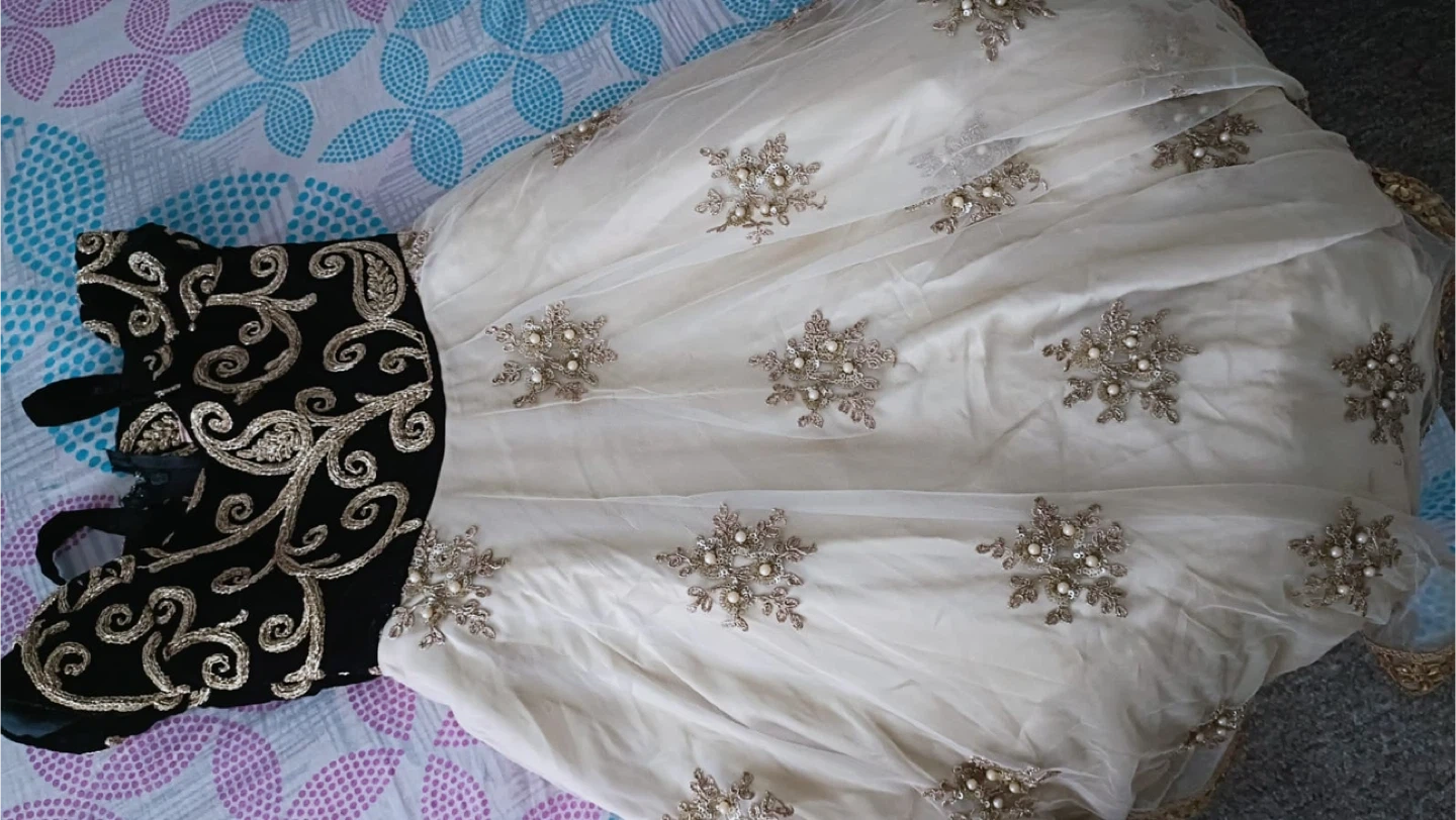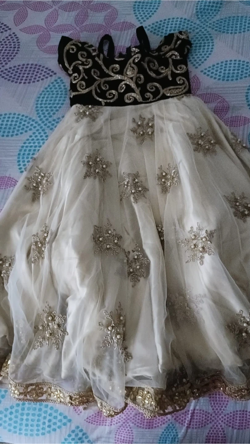 Beautiful embroidered dress with intricate detailing. The dress features a black velvet bodice with gold embroidery and a flowing white skirt adorned with snowflake-like embellishments. Perfect for a special occasion!