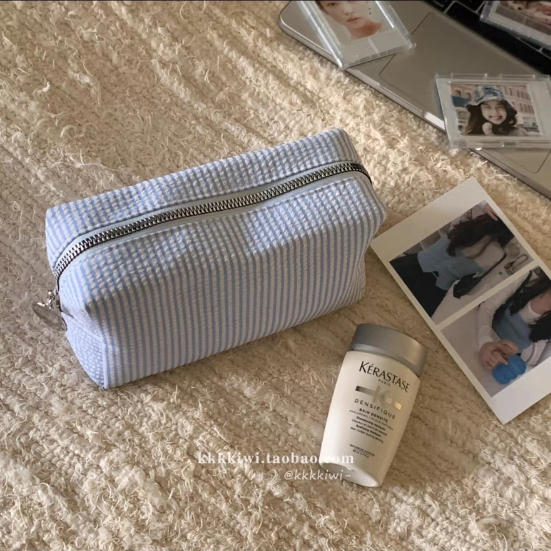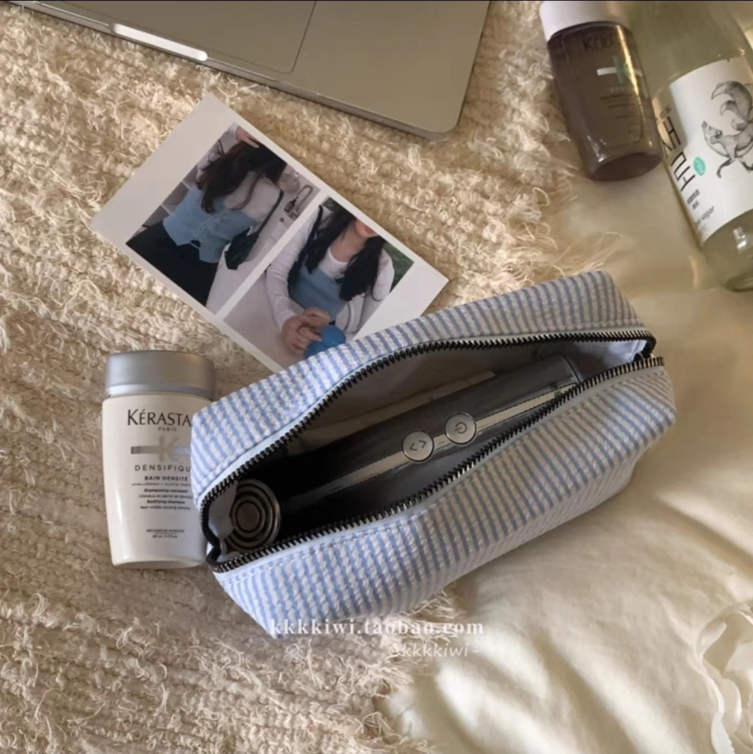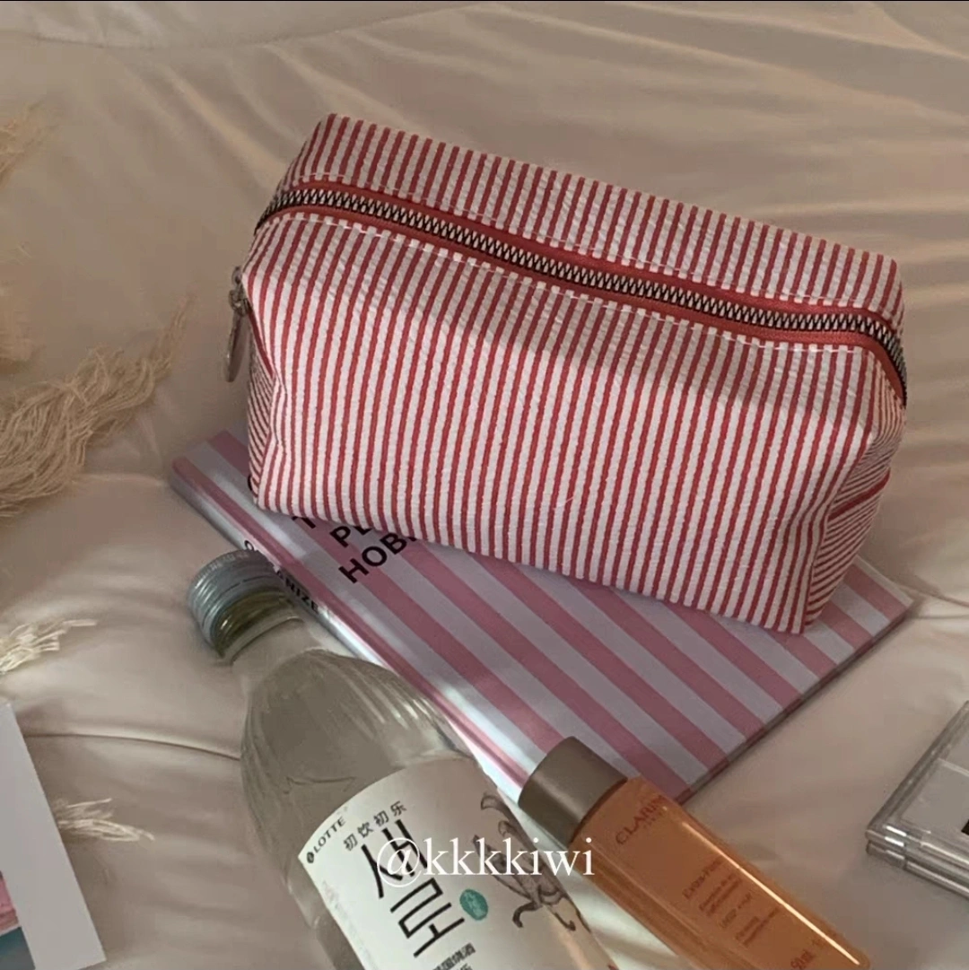 Cute striped makeup or cosmetic bag. Perfect for travel or everyday use! Available in red and white stripes.