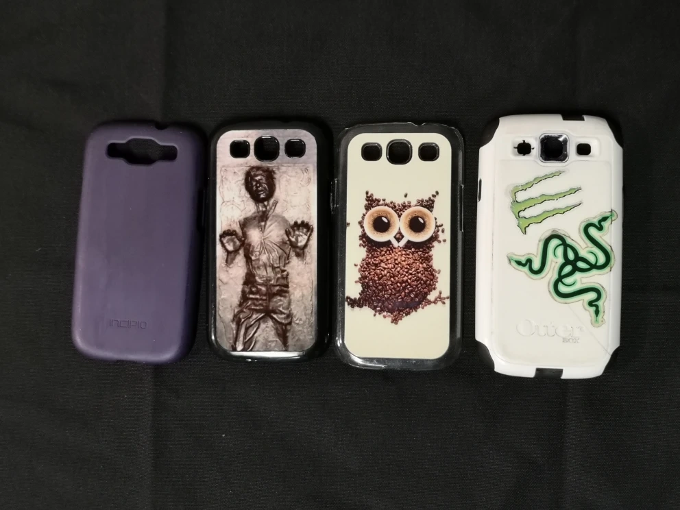 Nice unique cases for Samsung Galaxy S3 $5 each - White shell OtterBox - Purple rubber Incipio - Han Solo in Carbonite - Clear coffee night owl