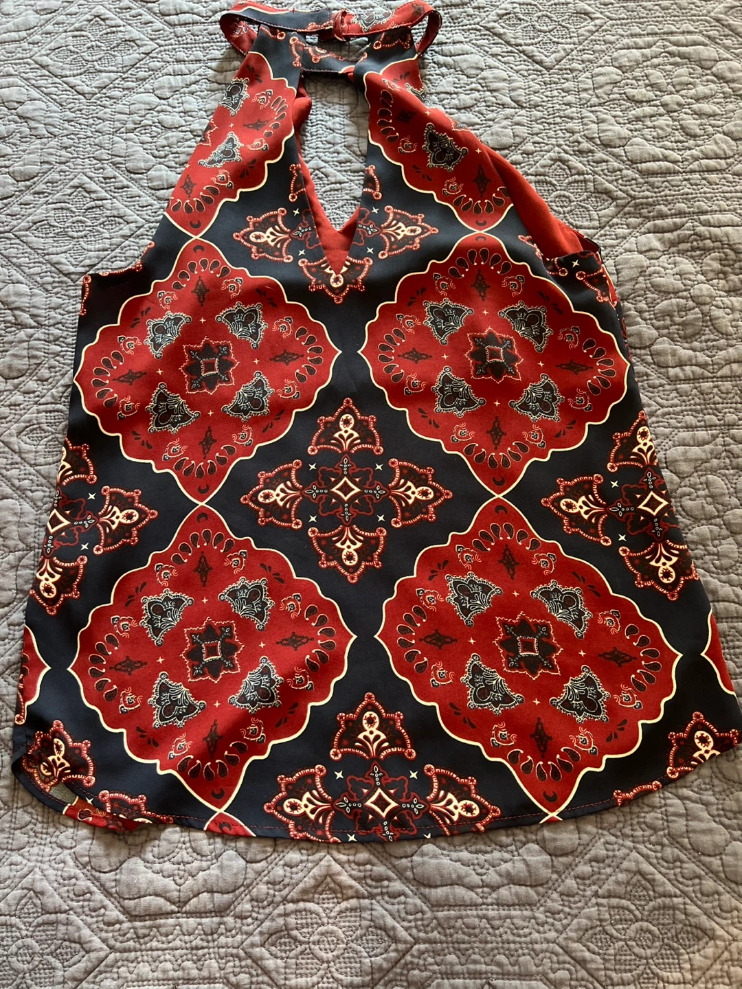 Selling a cute Dynamite halter top in size XS! It features a unique red and black pattern. Perfect for a night out or a casual day!