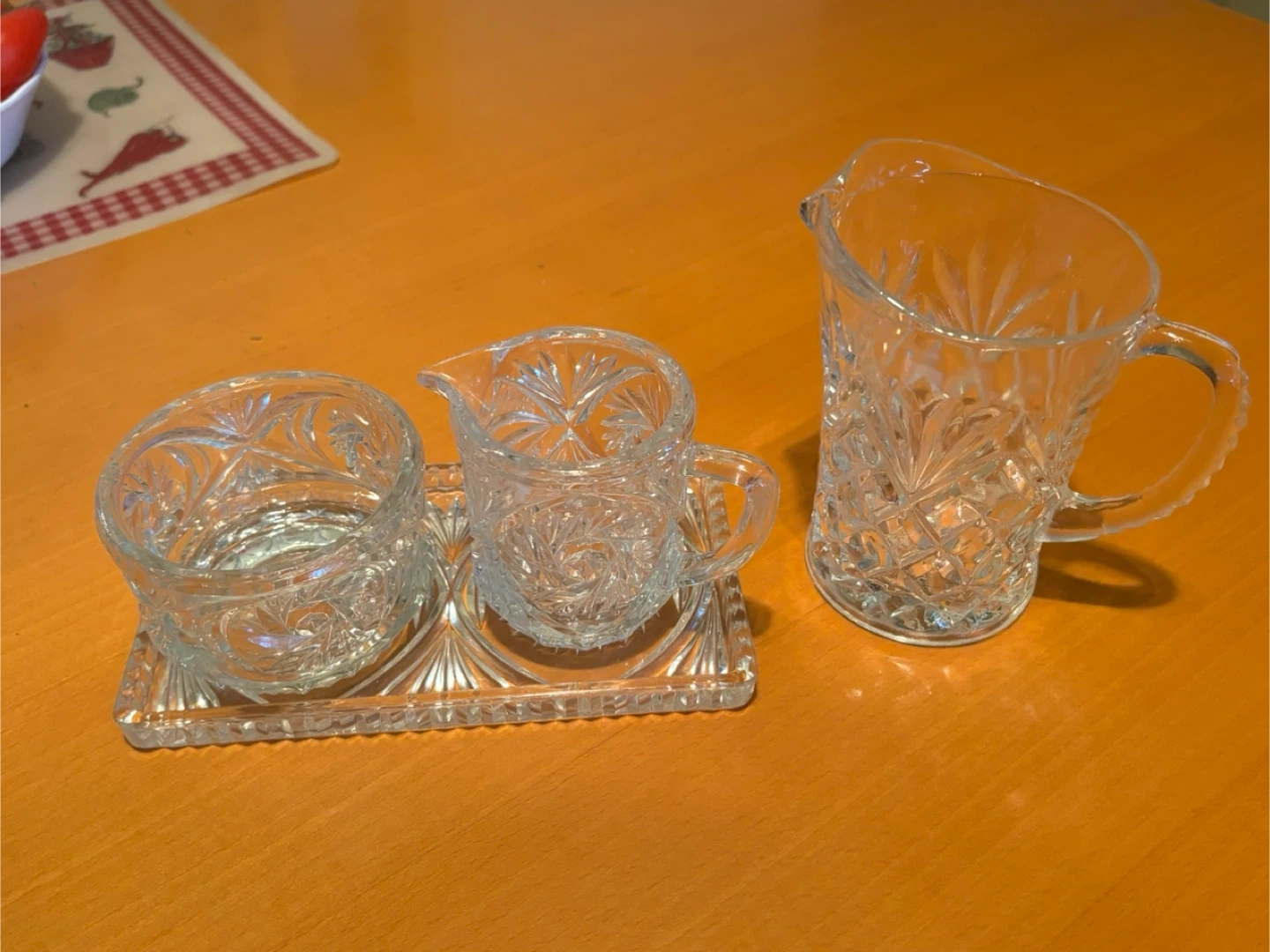 Selling a lovely crystal designed creamer, sugar bowl, and milk pitcher set.