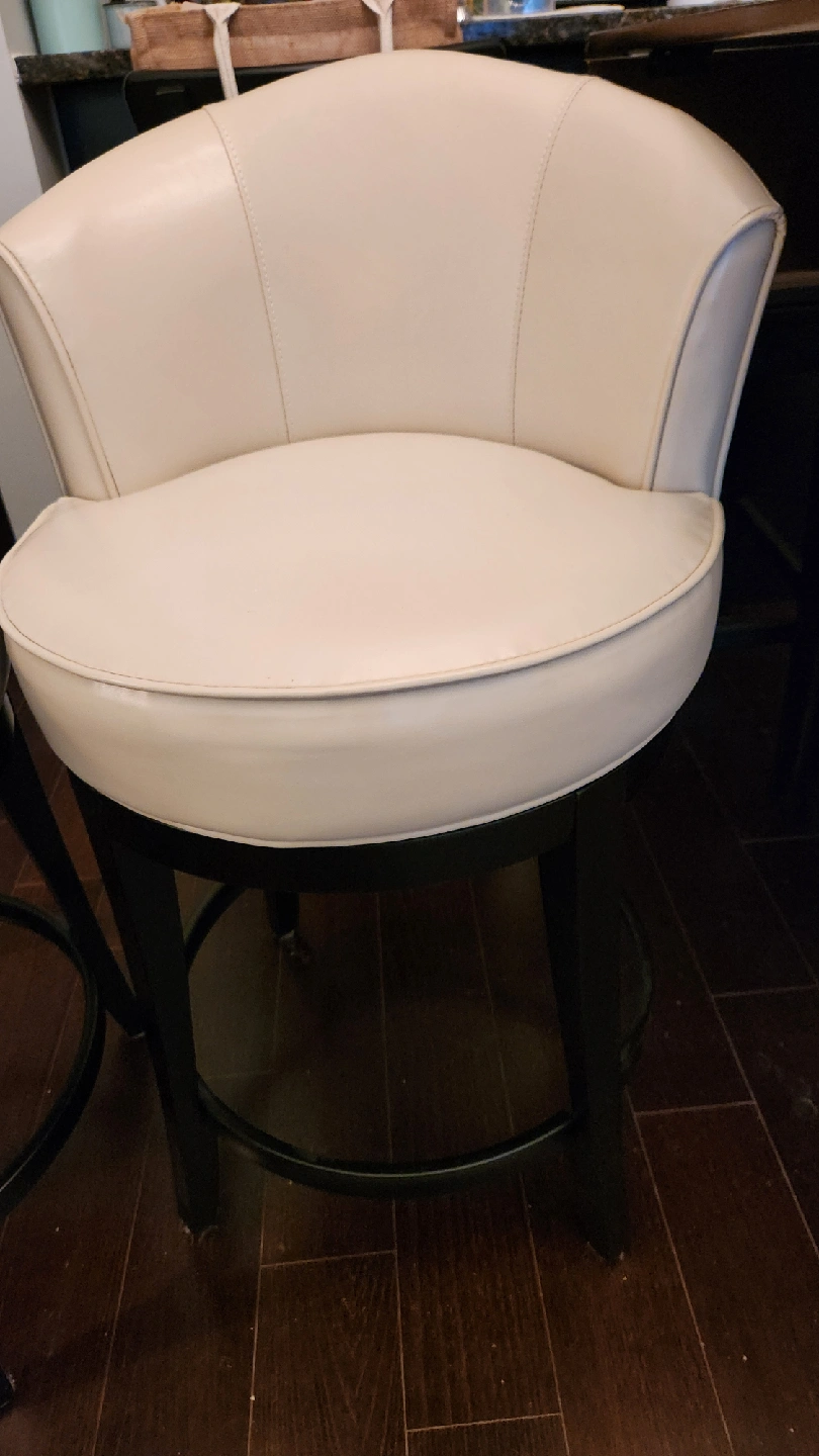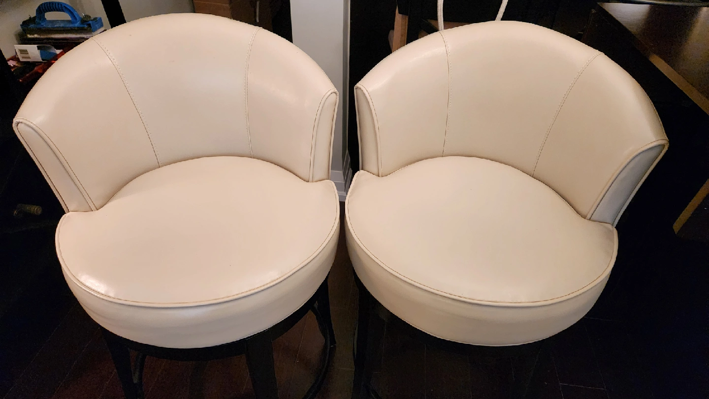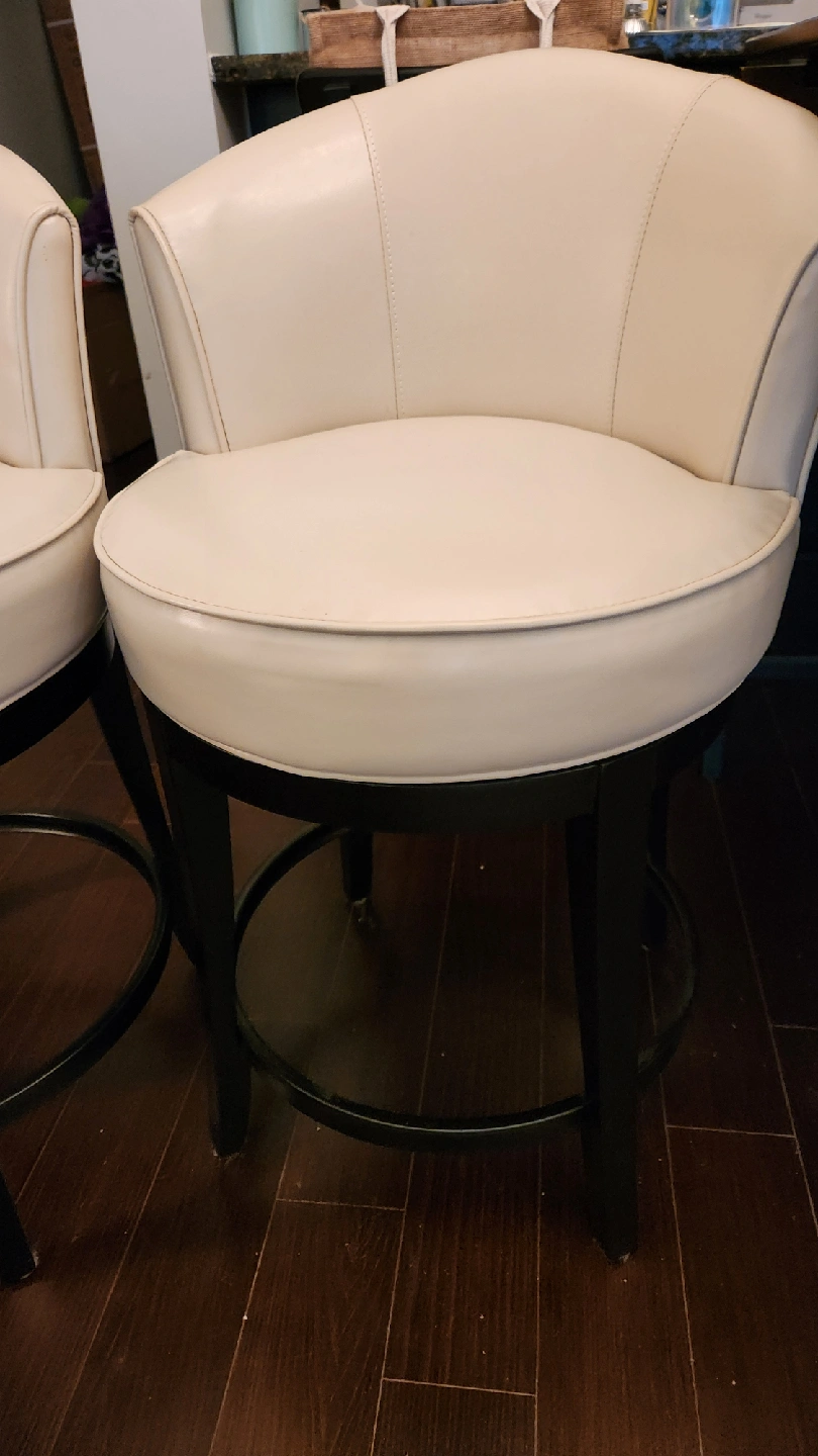 Selling a set of two swivel bar stools in a lovely cream colour. They're in great shape and would look fantastic in any kitchen or bar area. The material is smooth, easy-to-clean leather!