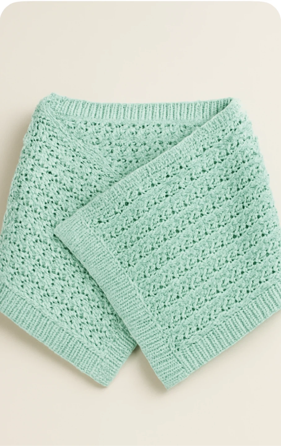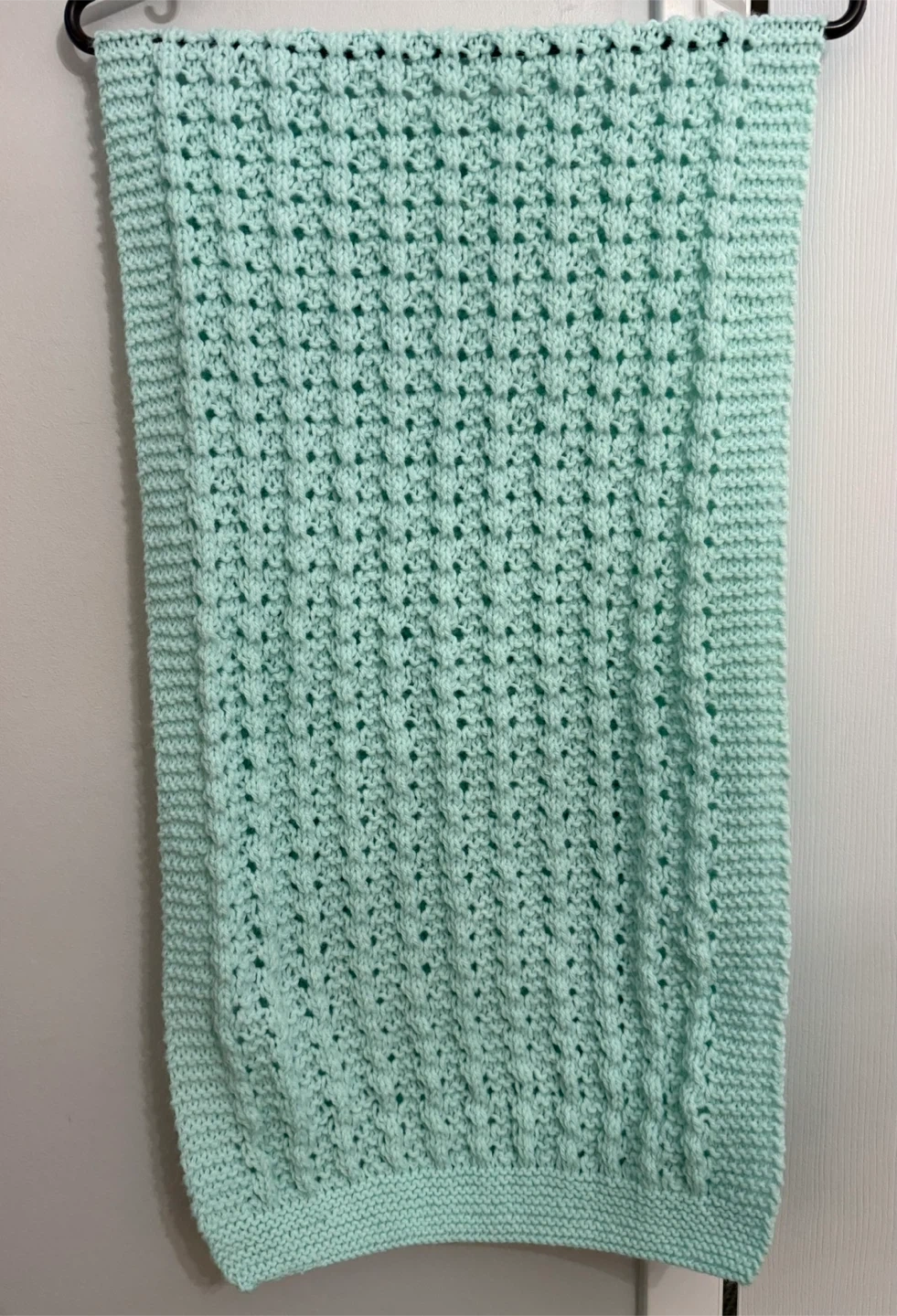 Selling a lovely, handmade knitted shawl. It's a beautiful pastel green colour and has a unique knitted pattern. Perfect for keeping you cozy and warm!