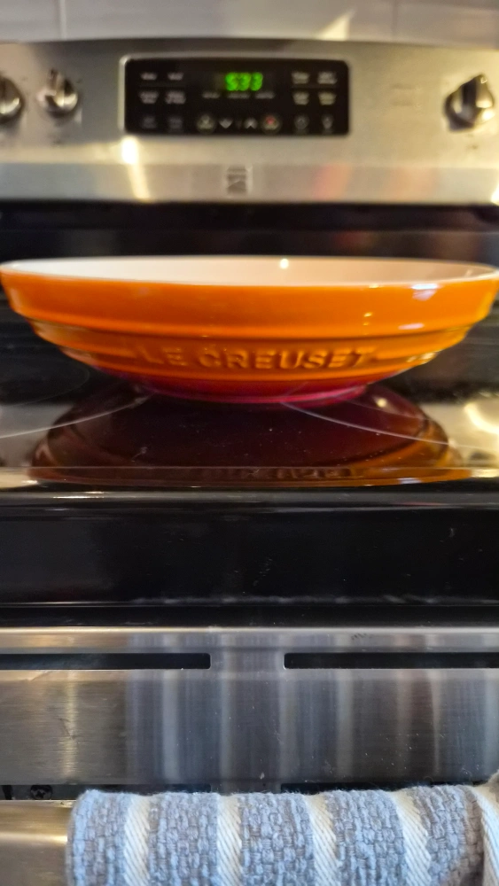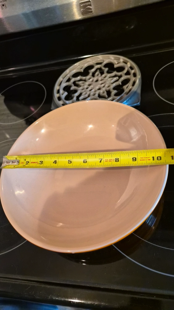Selling a Le Creuset serving bowl! It's a beautiful flame color and measures about 10 inches in diameter and 2 1/2 inches in height. Perfect for serving up your favourite pasta dishes!
