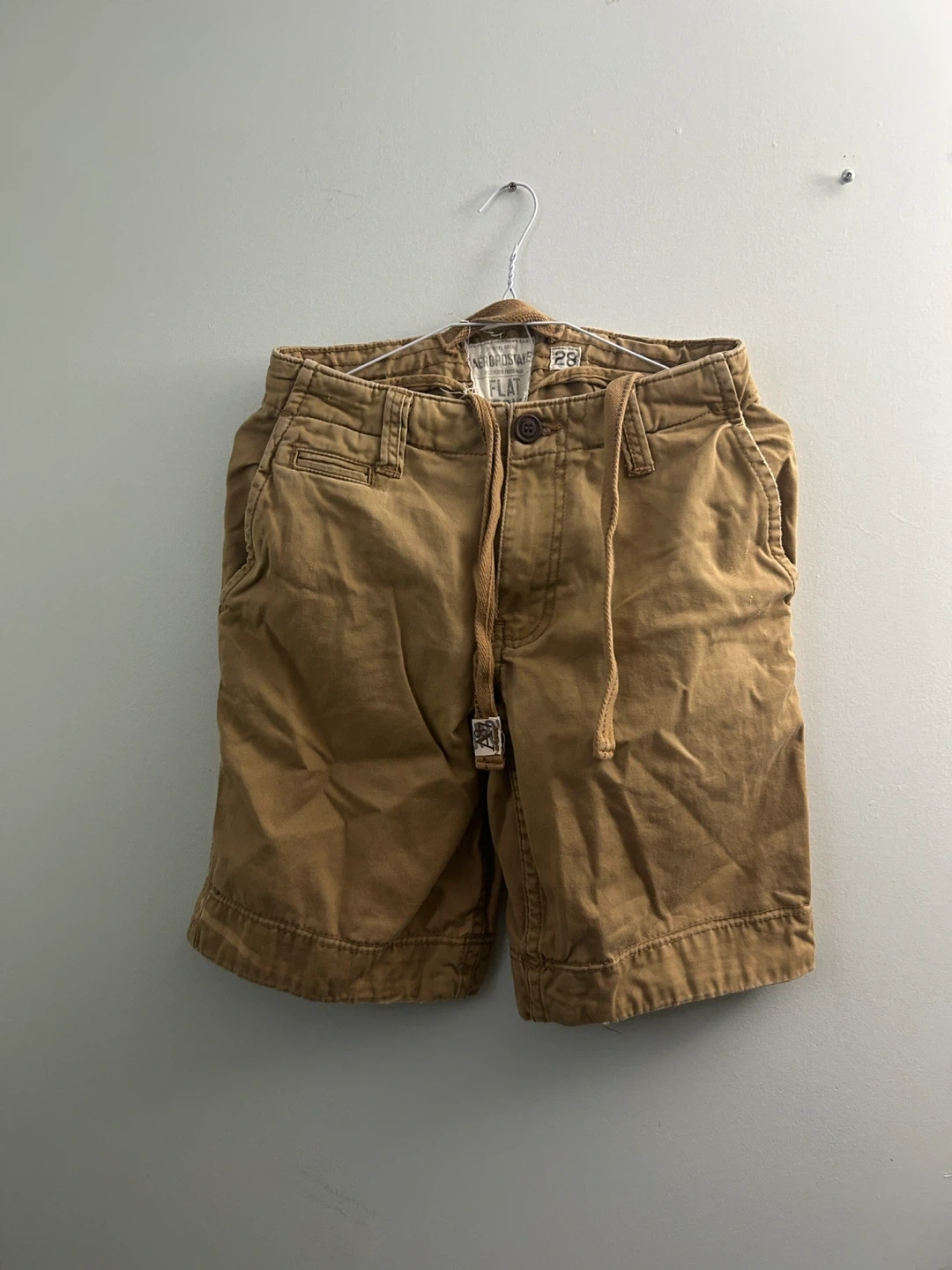 Selling a pair of Aeropostale flat front shorts in size 28. They're in good condition and have a classic khaki colour. Perfect for casual wear!