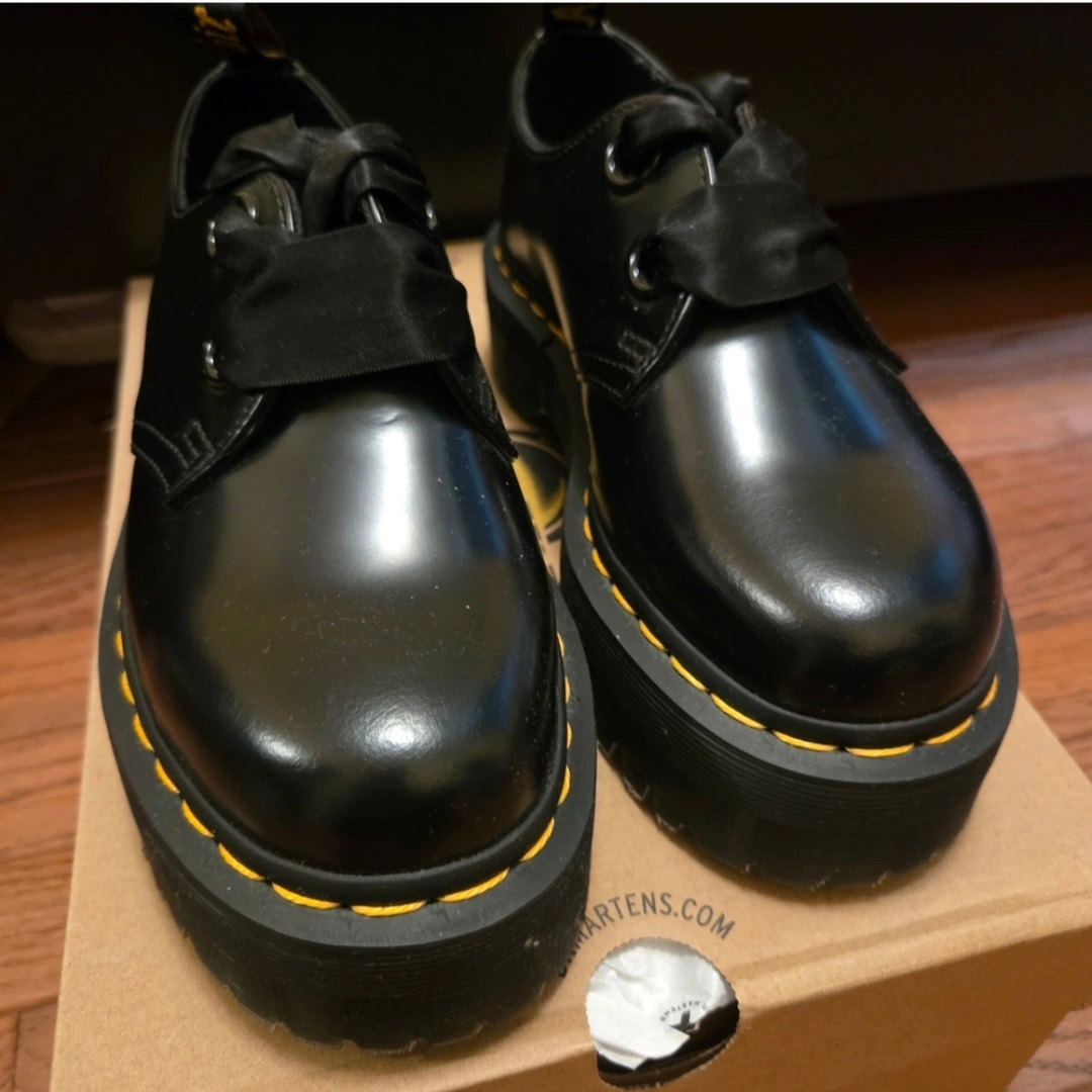 Selling a pair of Dr. Martens Holly platform shoes in black. Size 5 These stylish shoes feature a platform sole and ribbon laces, giving them a unique look. They're in brand new condition and come with the original box. Perfect for adding some edge to your outfit.