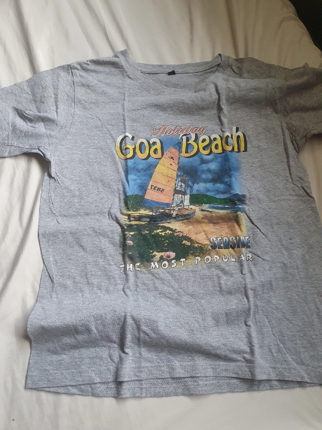 Selling a grey T-shirt with a 'Holiday Goa Beach' graphic. It has a seaside theme and is quite popular! Perfect for casual wear or a beach vacation