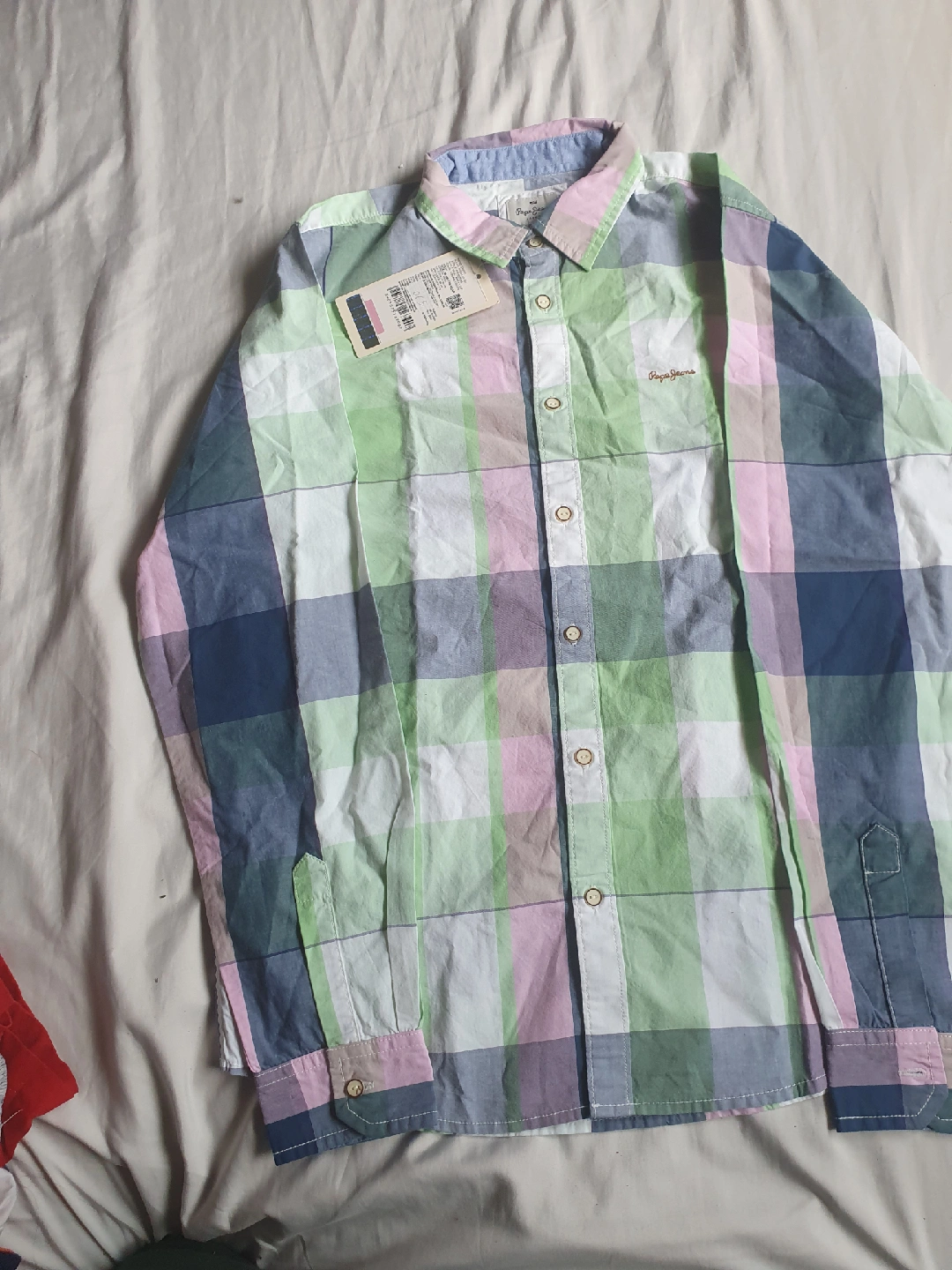 Here's a Pepe Jeans button-down shirt with a cool plaid pattern. It features a mix of colours, including green, pink, and blue. Perfect for a casual look!