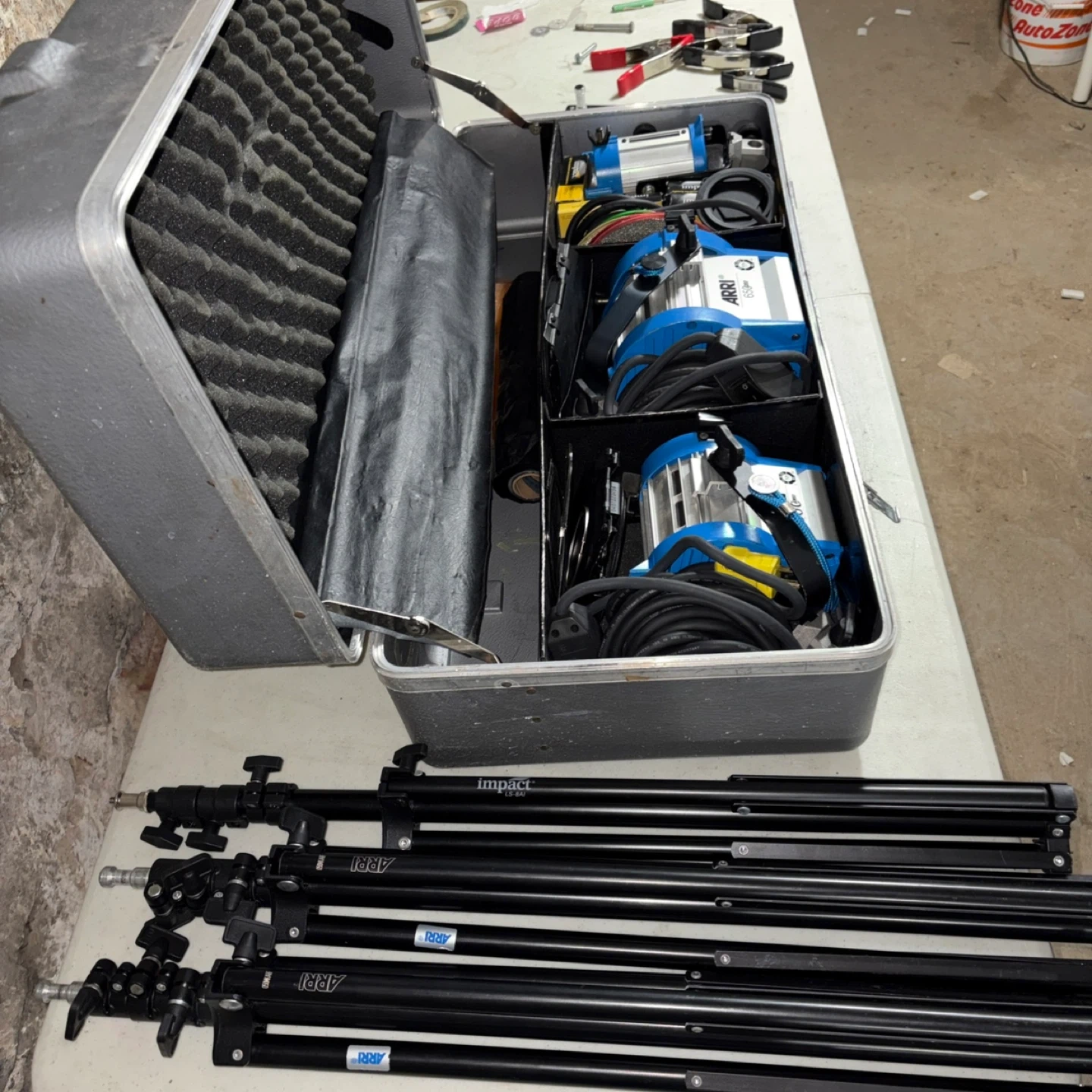 This listing includes two ARRI PLUS film lights, a 300W and a 150W, also a 650plus in a protective carrying case. Plus a stand for each light They're designed for professional lighting needs. The kit contains the lights, all necessary cables, and the case for transport and storage.