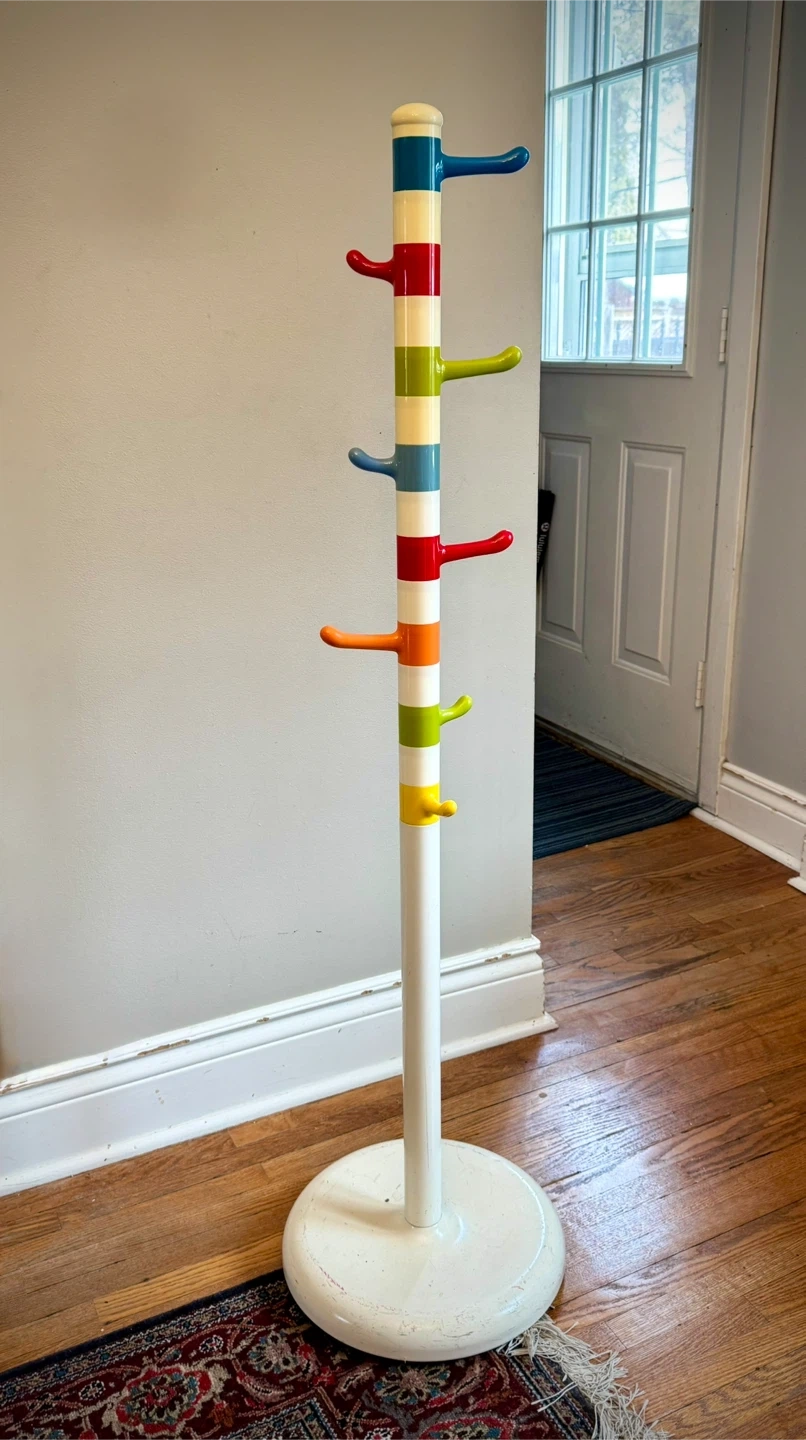 Lovely multicolour posts/hooks for hanging jackets. Very sturdy and in great condition. Some small scuffs around the solid heavy base but otherwise perfect.