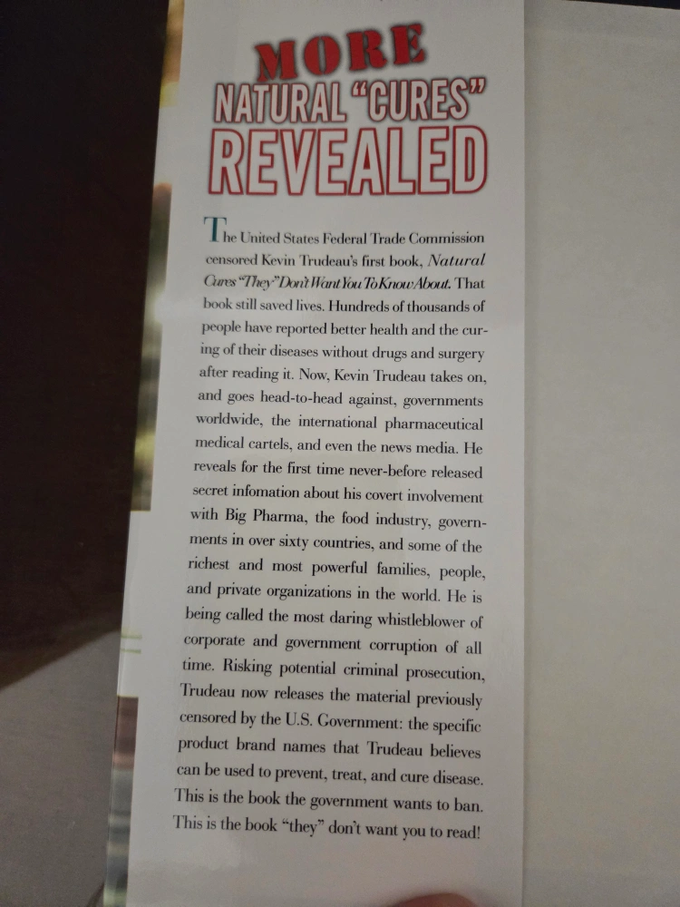 Selling the book "More Natural 'Cures' Revealed" by Kevin Trudeau. It's a #1 New York Times Bestseller of NATURAL CURES. The book is previously censored brand name products that cure disease.