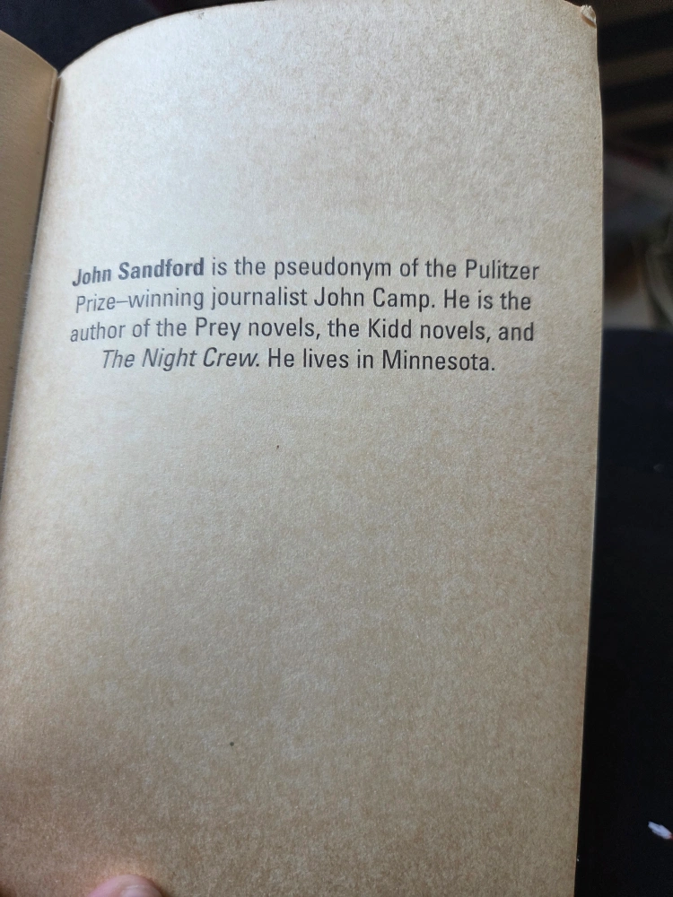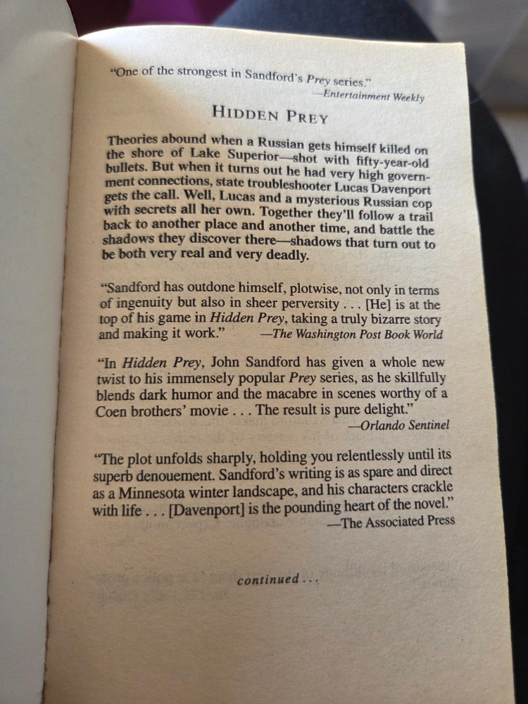 Selling the book Hidden Prey by John Sandford. It's part of the Prey series. A thrilling read!