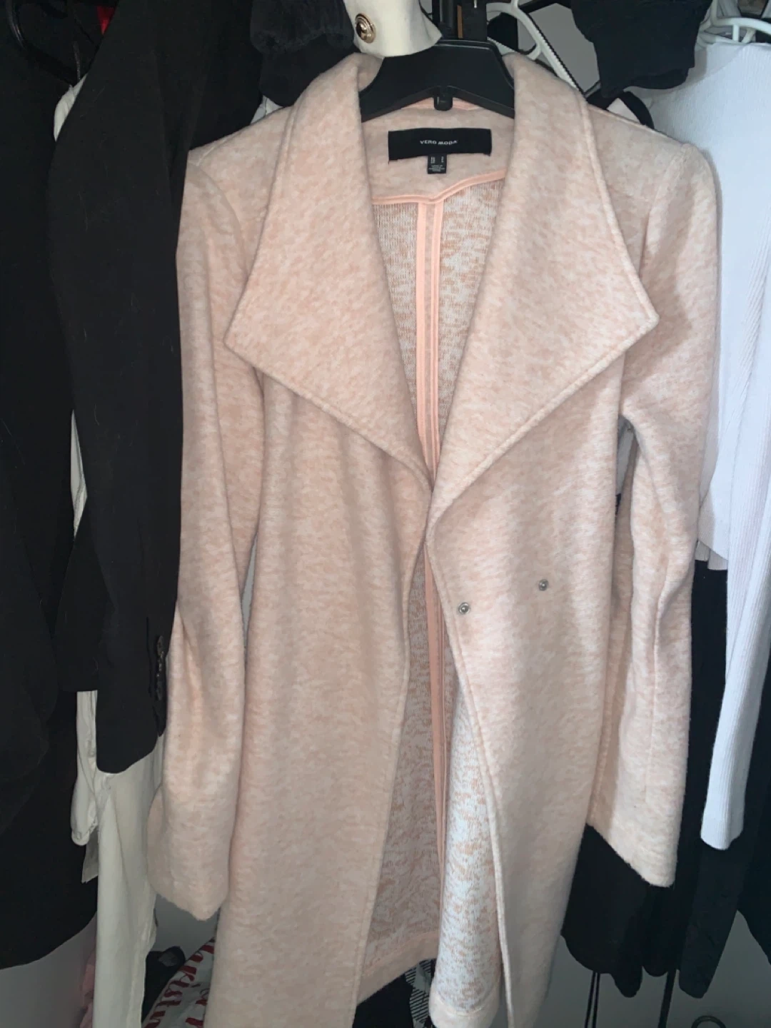 This is a cute Vero Moda pink coat with a belted waist. It's in great condition and perfect for spring or fall! It has pockets. The material is soft and cozy, and the belt allows you to cinch it at the waist for a flattering fit.