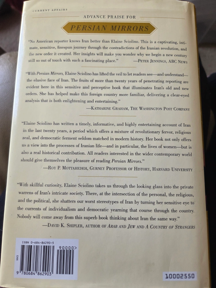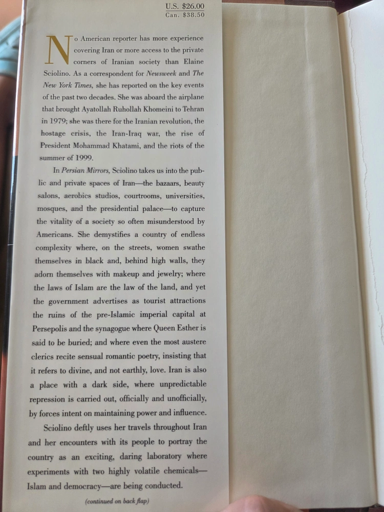 Selling the book Persian Mirrors: The Elusive Face of Iran by Elaine Sciolino. It offers a perspective on Iran through personal and political lenses. A thought-provoking read!