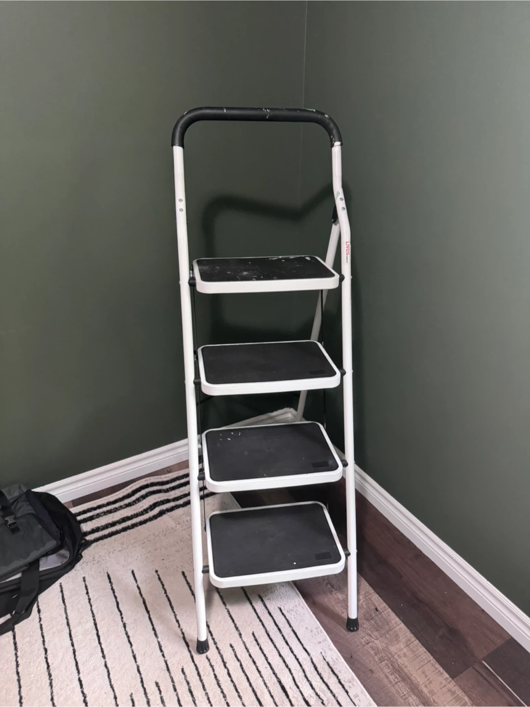 Selling a handy 4-step ladder! It's white with black steps and a black handle. Perfect for reaching those high shelves or doing some light home repairs. Pickup near Queen E & Coxwell.