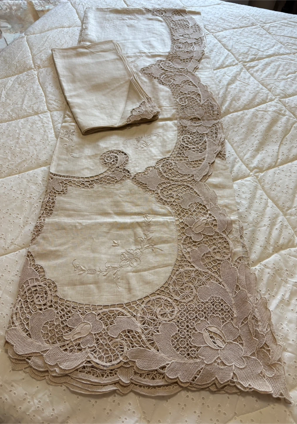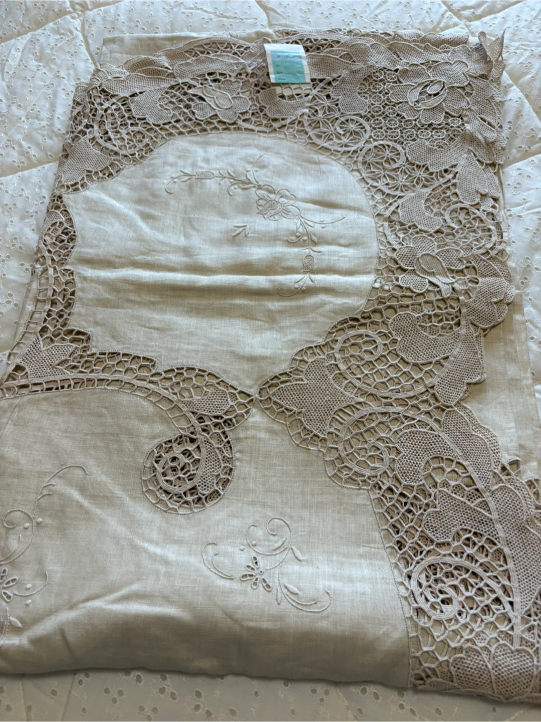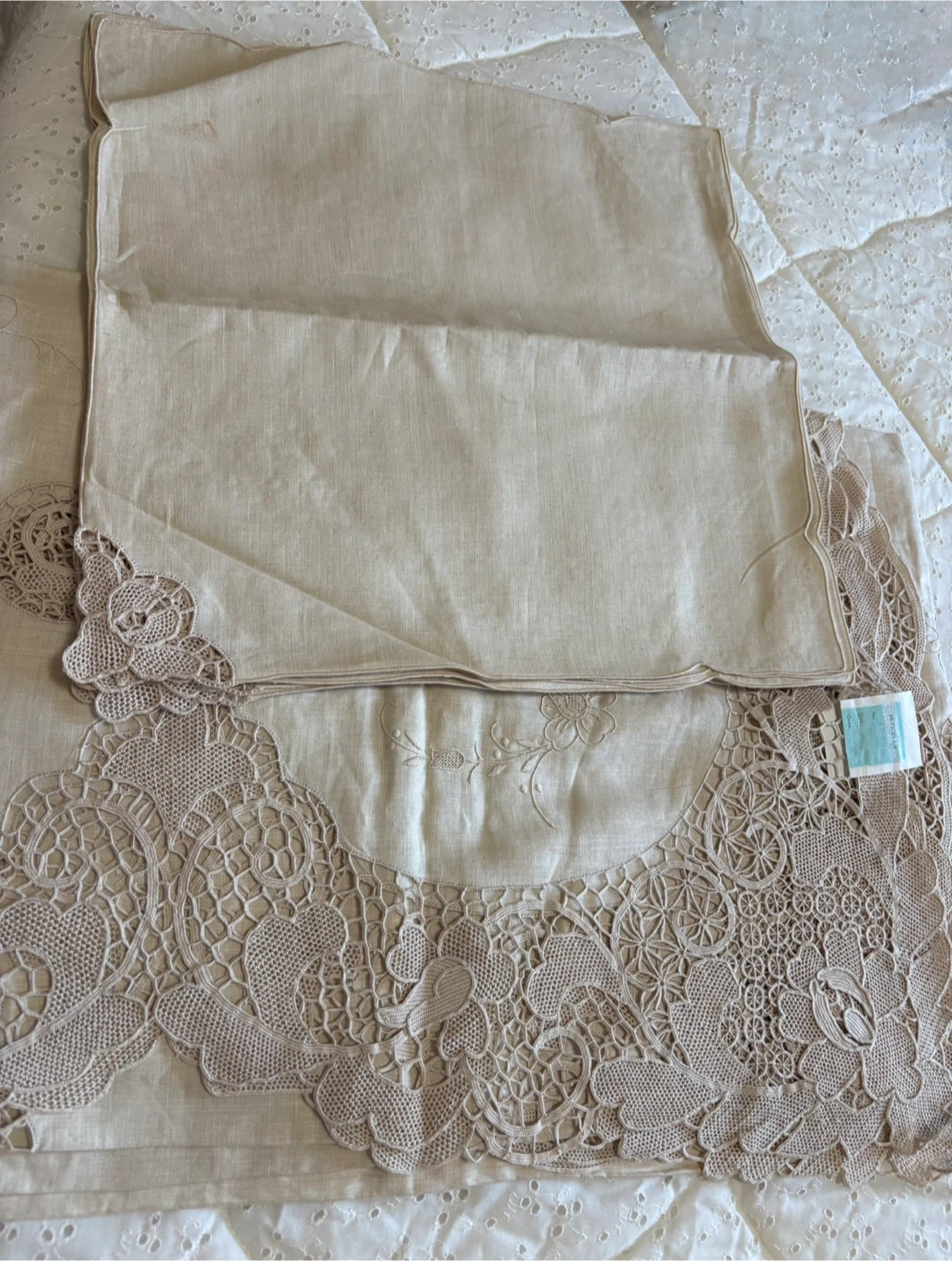 This exquisite, new Reticella linen set features a beautiful lace design, perfect for adding a touch of elegance to any dining or living space; includes a 72x108 inch tablecloth and napkins. This tablecloth is in pristine condition and with its delicate lace and refined embroidery, it promises to transform ordinary meals into unforgettable feasts. If the ad is up, it's available! Ready to give your table a glow-up!