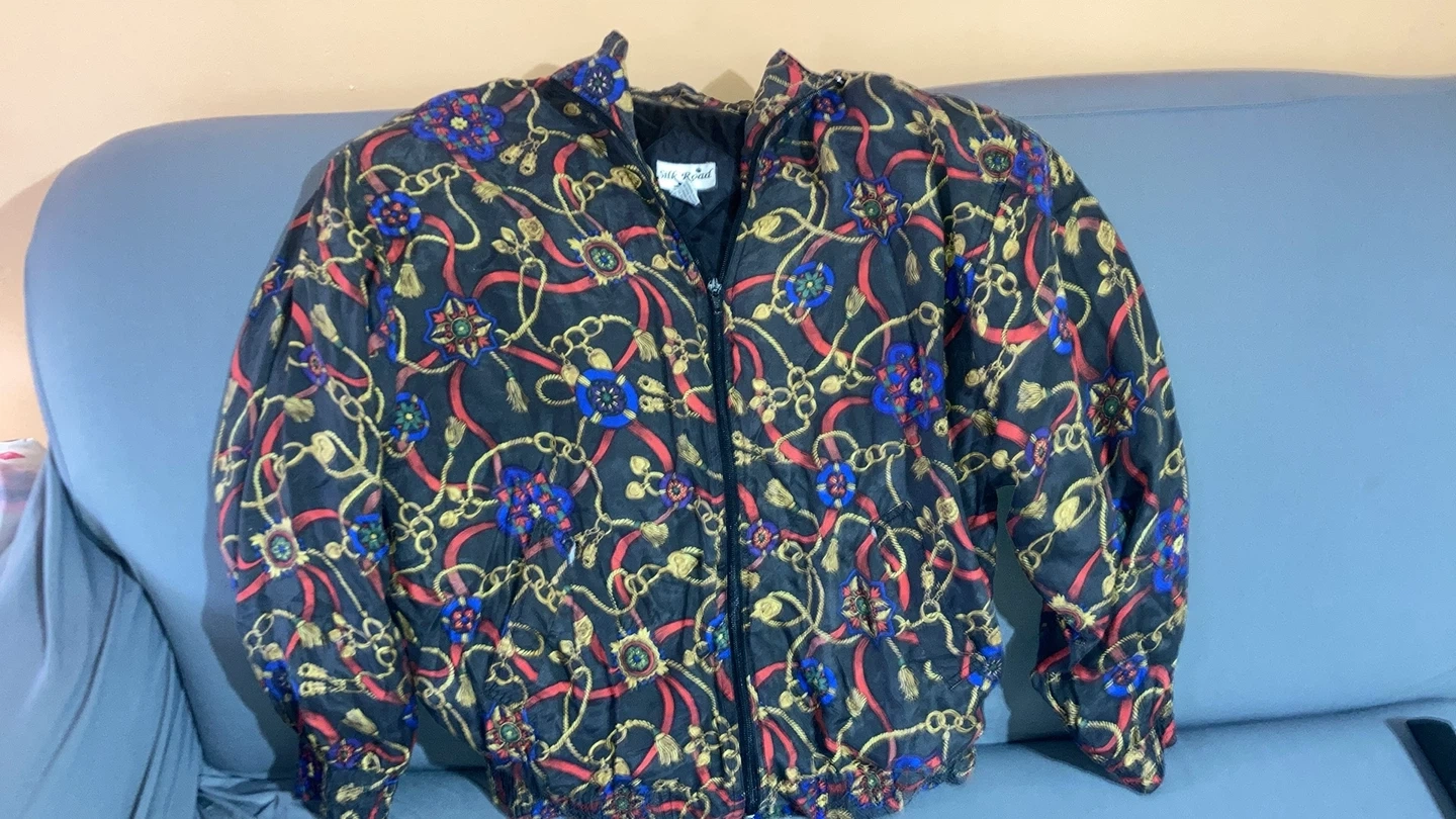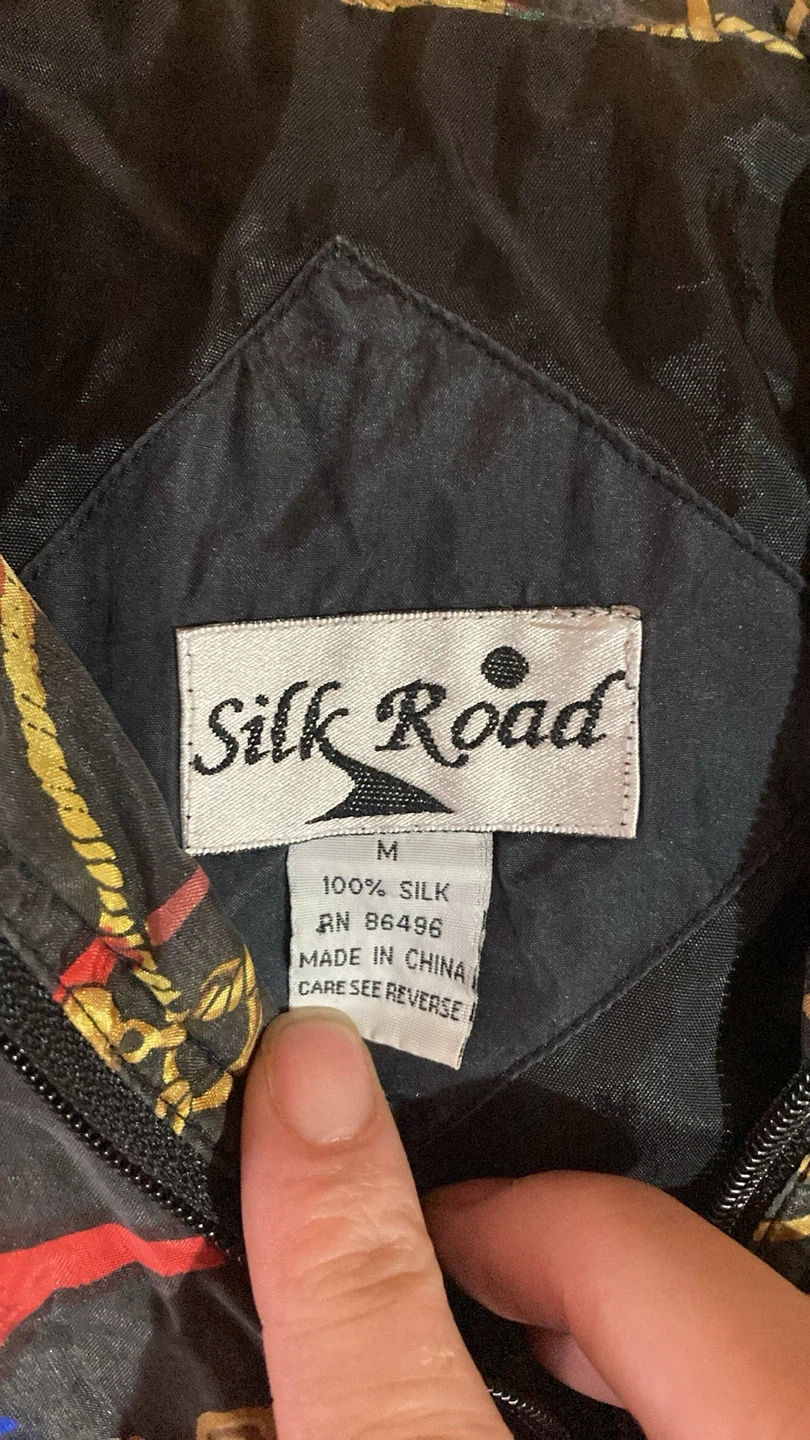 Selling a vintage Silk Road jacket in size medium! Excellent condition. It's made of 100% silk and has a unique pattern with gold chains, red ribbons, and blue accents on a black background. It's a lightweight and stylish piece! Pickup near Islington and Steeles