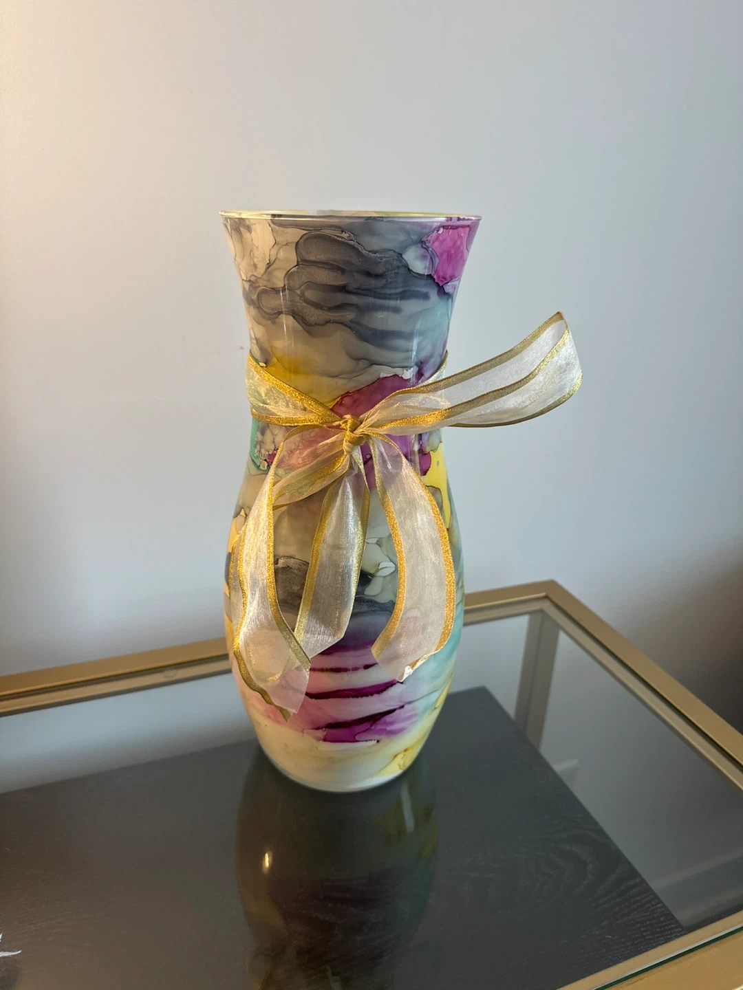 Selling a pretty decorative art glass vase. It has a unique design with swirls of grey, yellow, and purple, and it's tied with a gold-trimmed ribbon. Perfect for adding a touch of colour to any room!