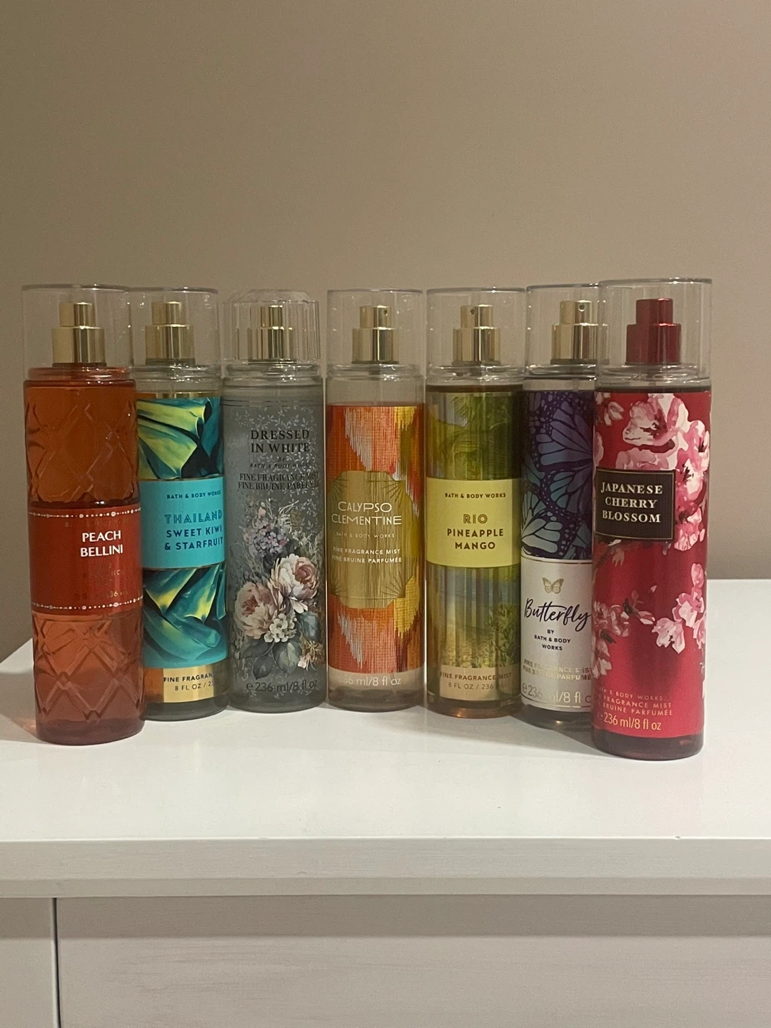 Selling a bundle of 7 Bath & Body Works Fine Fragrance Mists! Includes: - Peach Bellini - Thailand Sweet Kiwi & Starfruit - Dressed in White - Calypso Clementine - Rio Pineapple Mango - Butterfly - Japanese Cherry Blossom Each bottle contains 236 ml / 8 fl oz
