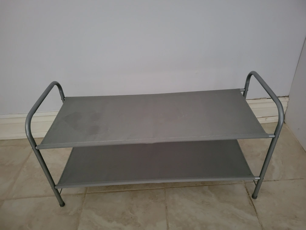 Selling a handy grey two-tier shoe rack. It's perfect for keeping your entryway or closet organized. It's in good condition and ready for a new home!