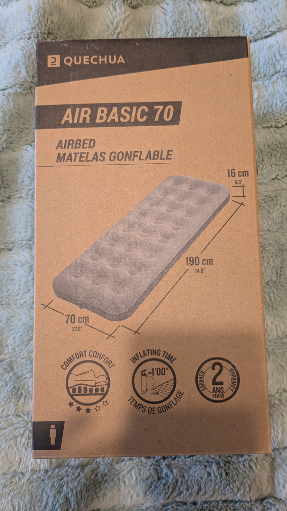 Selling a brand new Quechua Air Basic 70 airbed, still in its original box! This airbed is perfect for camping or having guests over. It measures 190 cm x 70 cm x 16 cm when inflated. It's lightweight and portable, making it easy to take with you on any adventure. Inflating time is around 1 minute