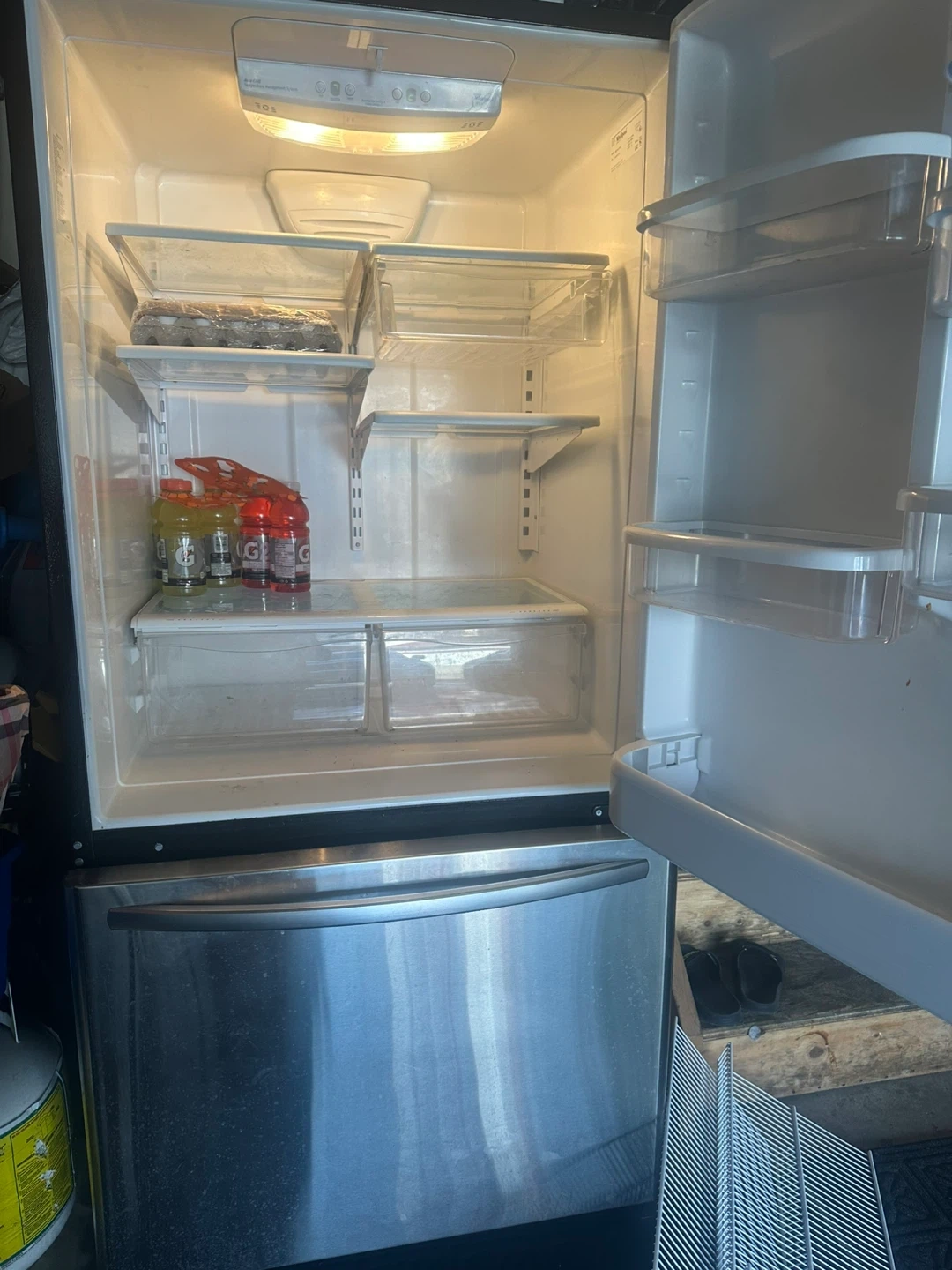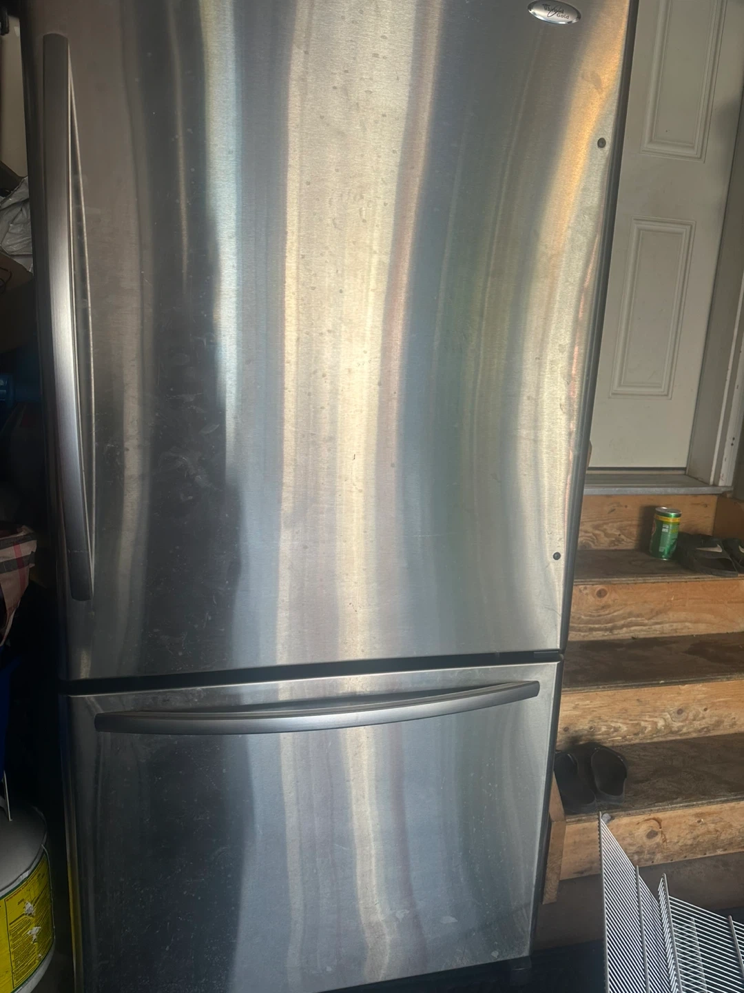 Selling a Whirlpool refrigerator with a bottom freezer. It's stainless steel and in good working condition. Perfect for a family or anyone needing extra fridge space! It’s in our garage right now, using as my extra fridge, it works really good we just needed a bigger fridge and will clean it once it’s sold.