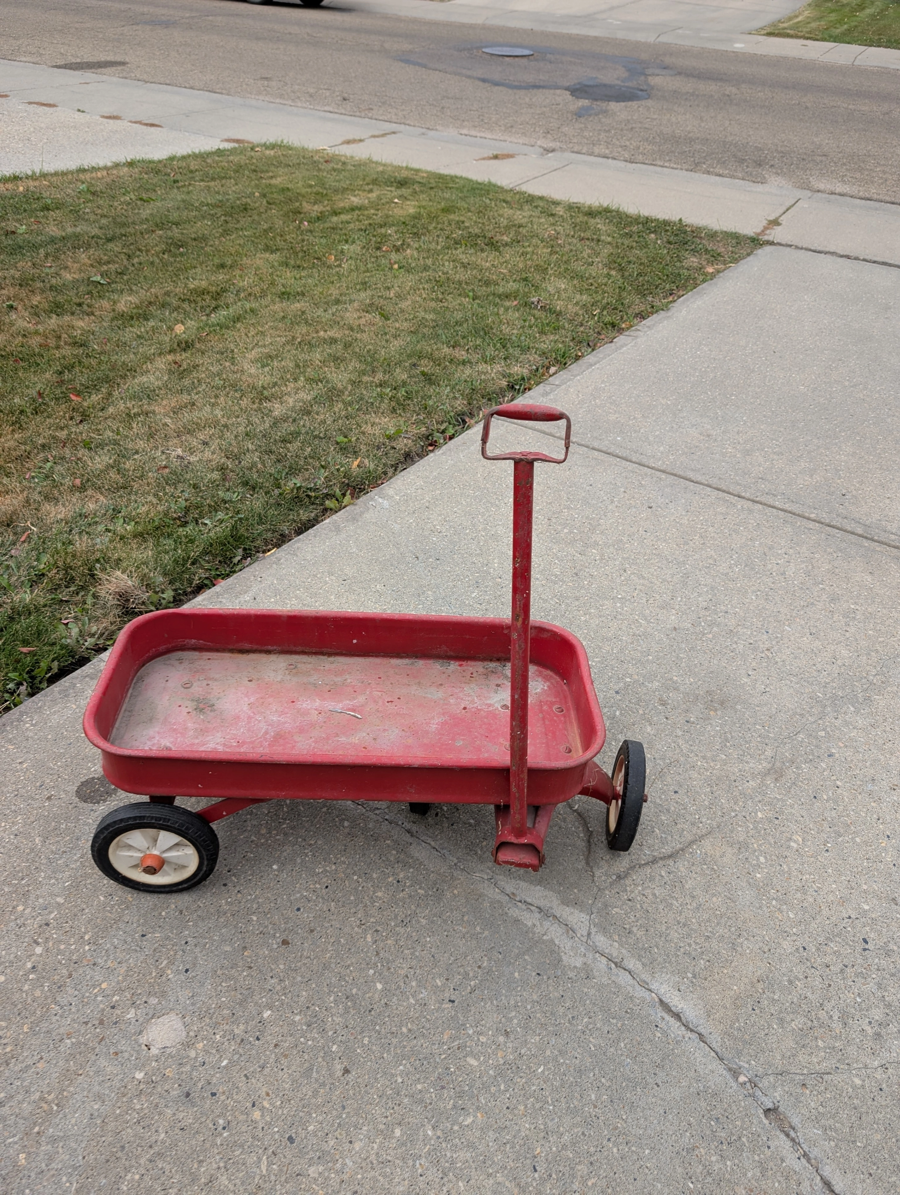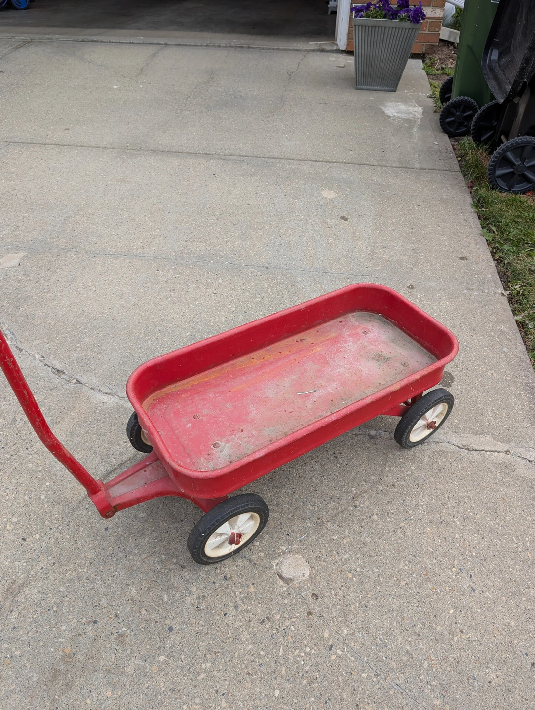 Selling a Vintage Radio Flyer in good condition. Classic sturdy steel frame with working handle and wheels—perfect as a collectible, for décor, or for light outdoor use; selling because I am moving and ca not take it along.