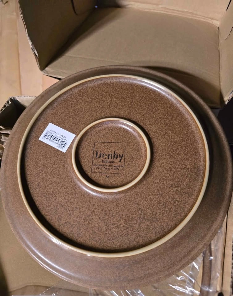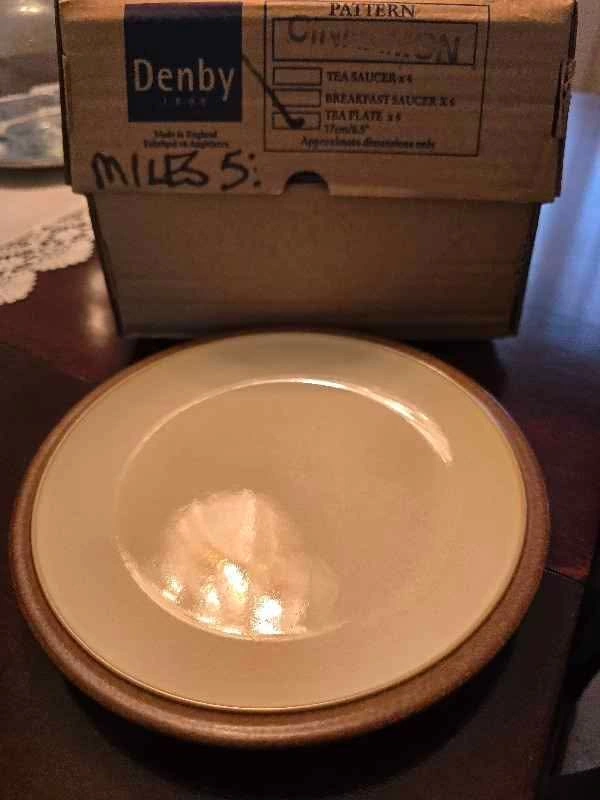 15Set of 6 tea plates for $100 Size: 9" diameter Colour: Taupe with stone brown edging Brand: Denby Pottery, made in England AUTHENTIC New in box, wrapped and never used Check out my other matching stoneware. Less expensive than buying directly from Denby! Cash sale please. Pick up only in North Oshawa