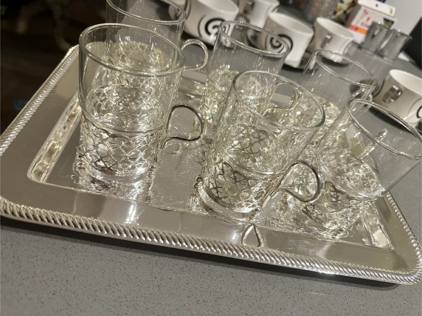 Set of glass coffee cups with a decorative silver tray. Great for serving coffee or tea to guests