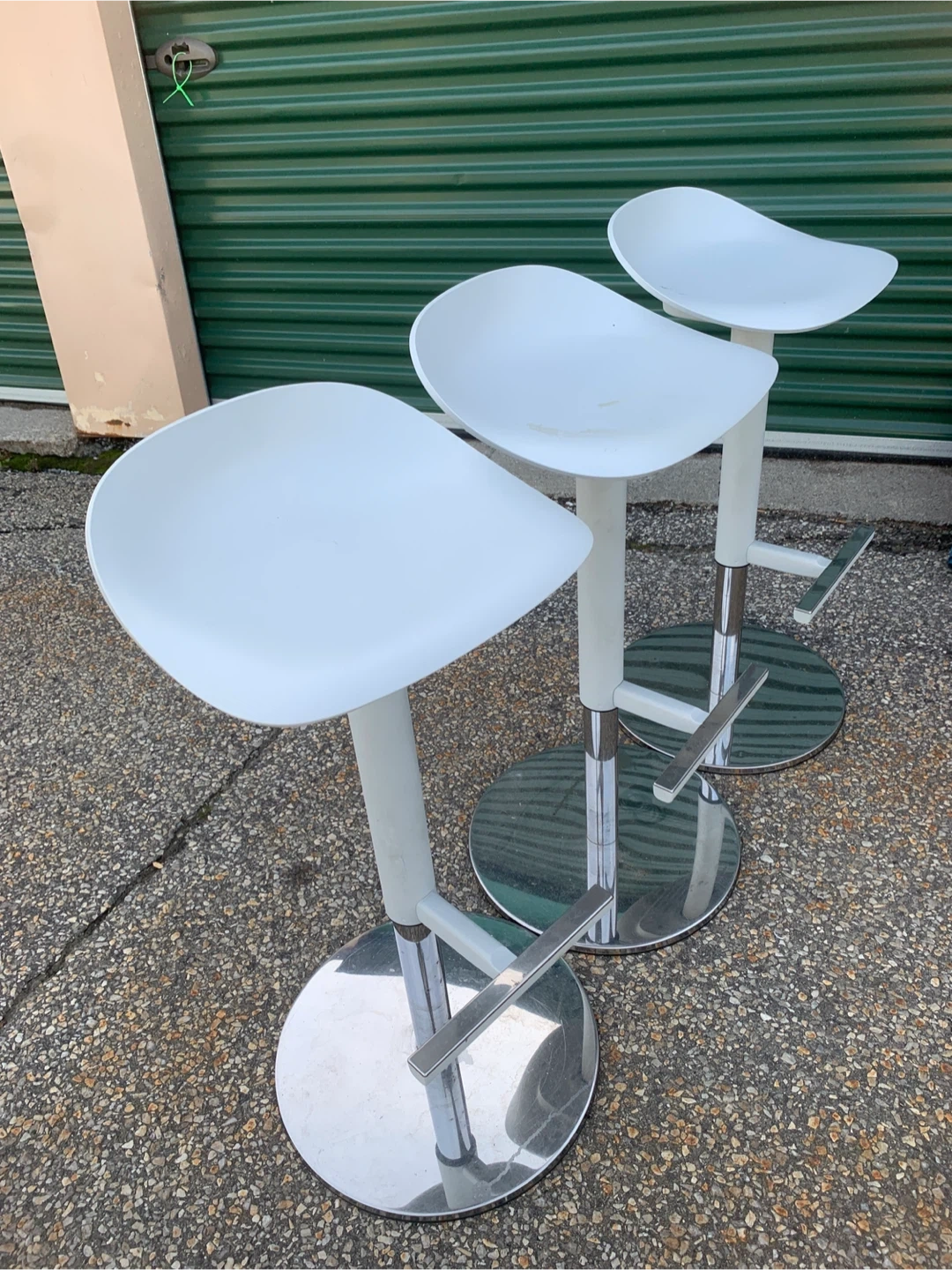Selling a set of three bar stools. They feature white seats and chrome bases with footrest. Perfect for a kitchen island or bar area!