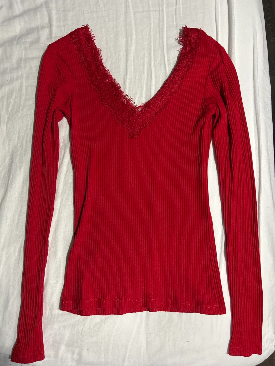 A cute red long sleeve top with a delicate lace trim around the V-neck. It's in great condition and perfect for layering or wearing on its own. The ribbed texture adds a nice touch!