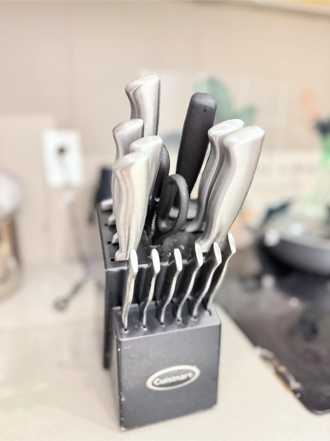 Selling a new Cuisinart knife block set. It includes a variety of knives, sharpening steel, and kitchen shears. A great addition to any kitchen! (Just butter knife’s used couple of times)