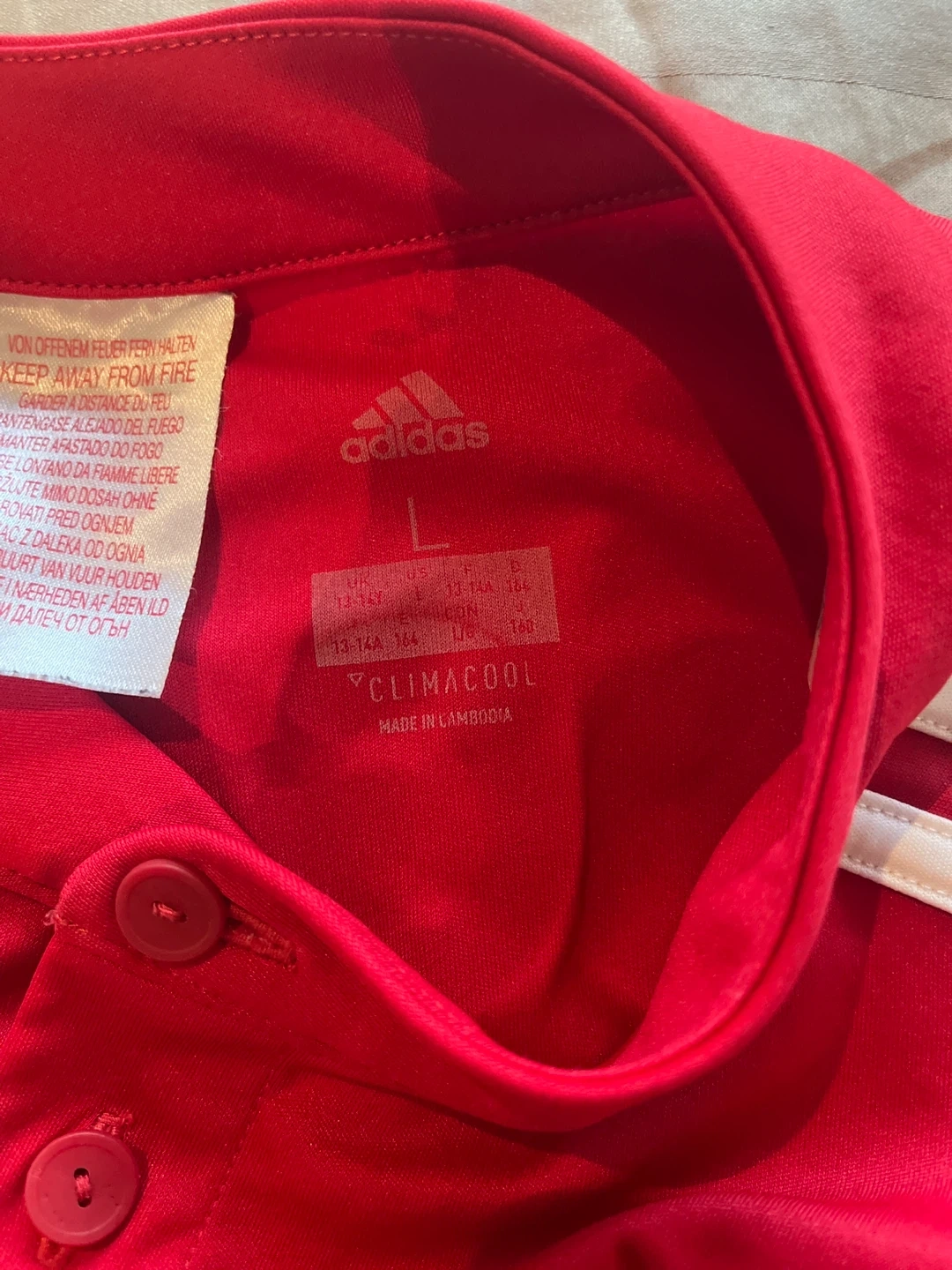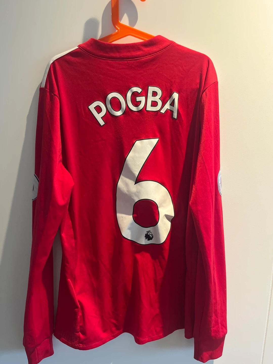 65Selling an Adidas Manchester United jersey with Pogba's name and number 6 on the back. It's a long-sleeved jersey in size youth L. The jersey features the Chevrolet logo on the front and the Adidas logo on the sleeve. It also has Climacool technology to keep you cool and comfortable.