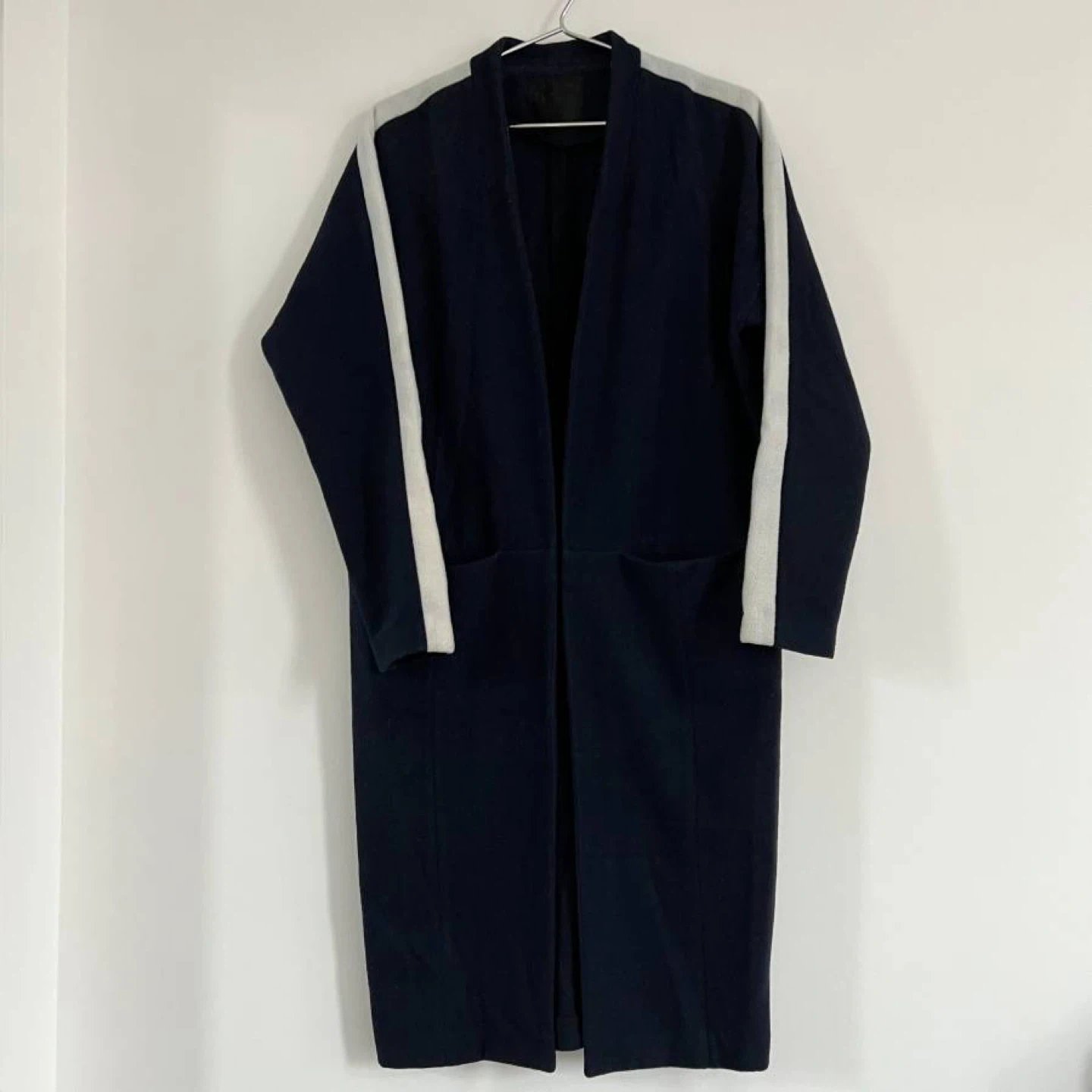 Just Female Denmark Navy Wool Spring Kimono Jacket Size: XS Designed in Copenhagen, Denmark Beautiful kimono style jacket with contranst cream stripe on sleeve, perfect for layering for fall/winter Pick up in Vancouver Ganni APC Sezane Staud Cecilie Bahnsen Simone Rocha Paloma Wool Sandy Liang Reformation Rouje Sandro Maryam Nassir Zadeh Isabel Marant Everlane Madewell Bode Studio Nicholson Toteme The Row Gimaguas Glossier Ciao Lucia Doen Sea New York Djerf Avenue Deiji Studios Rachel Comey Xirena Acne Studios Simon Miller The Frankie Shop One of a Few SSENSE Gravity Pope