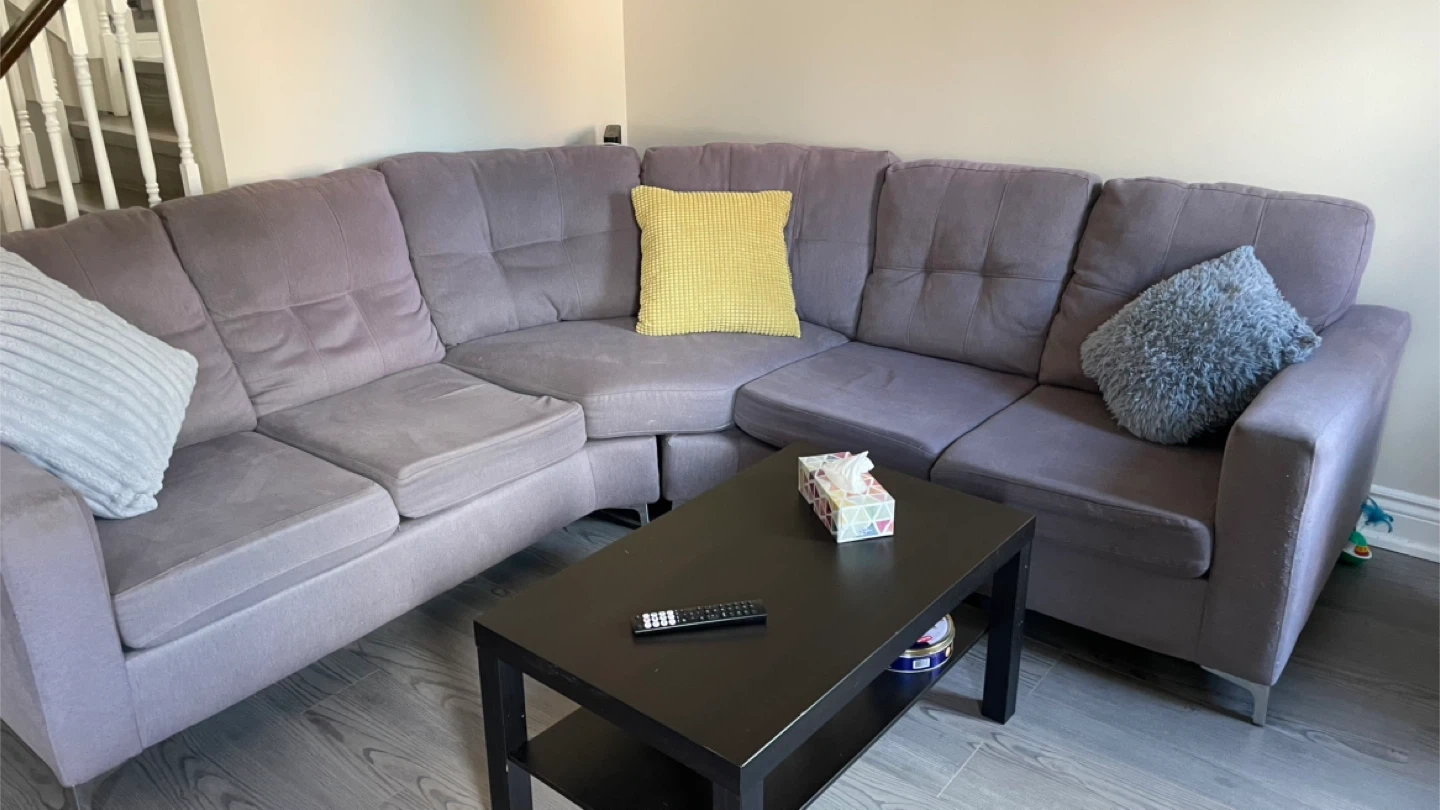Selling a comfortable grey sectional sofa. It's in good condition and would be a great addition to any living room! The cushions are soft and the fabric is durable