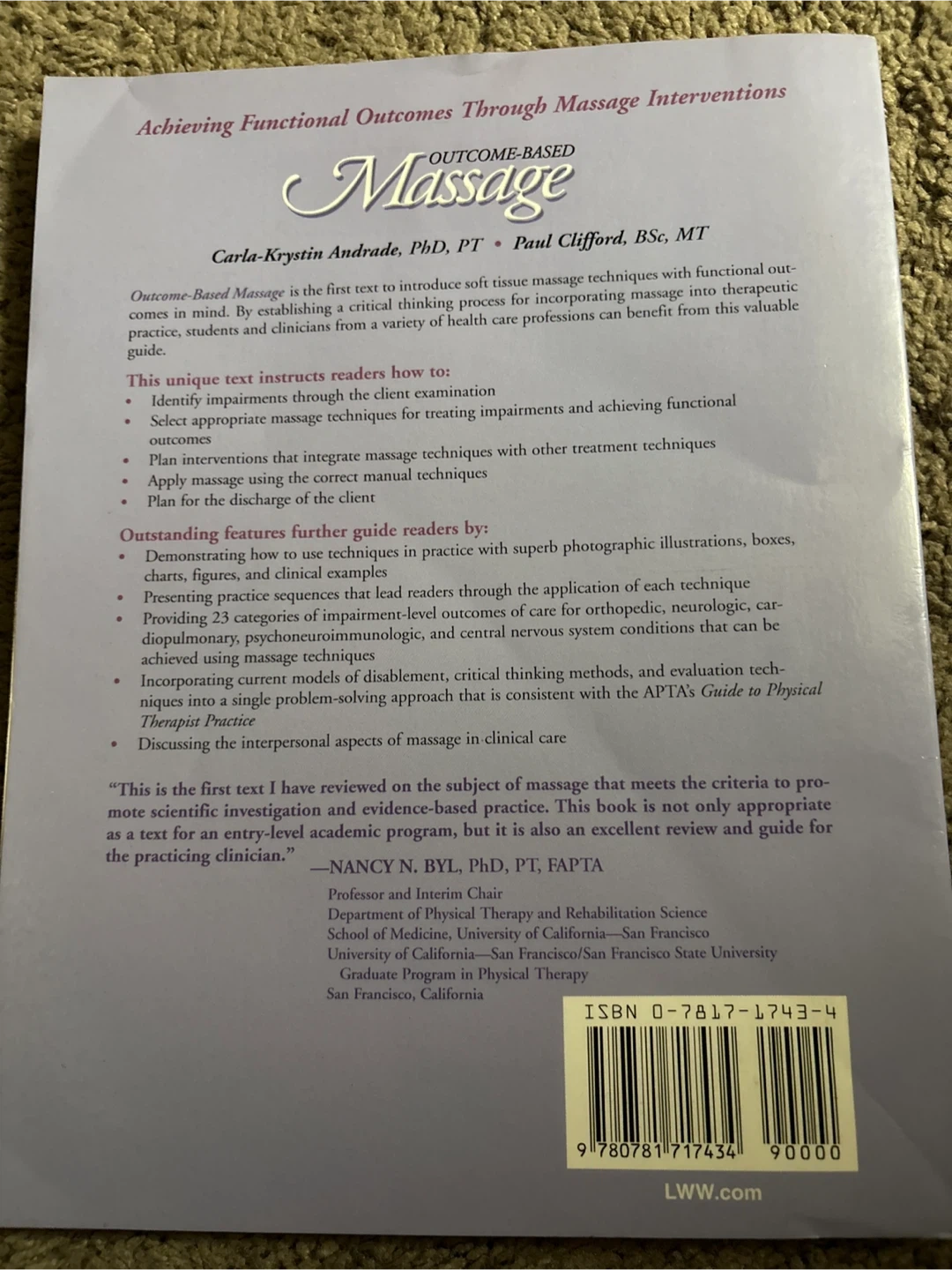 15Selling a textbook titled 'Outcome-Based Massage' by Carla-Krystin Andrade and Paul Clifford. This book is designed to introduce soft tissue massage techniques with a focus on achieving functional outcomes. It's a valuable resource