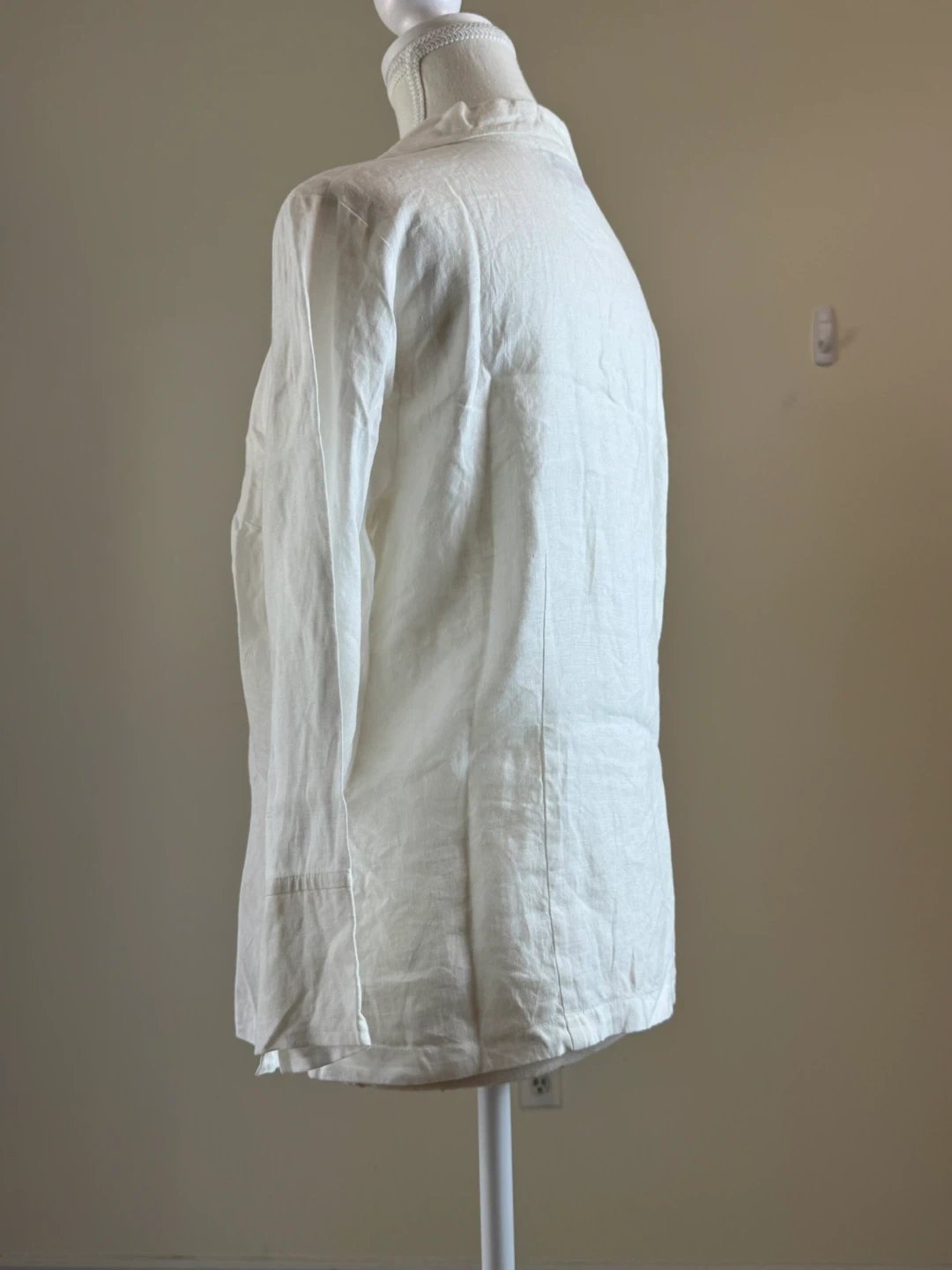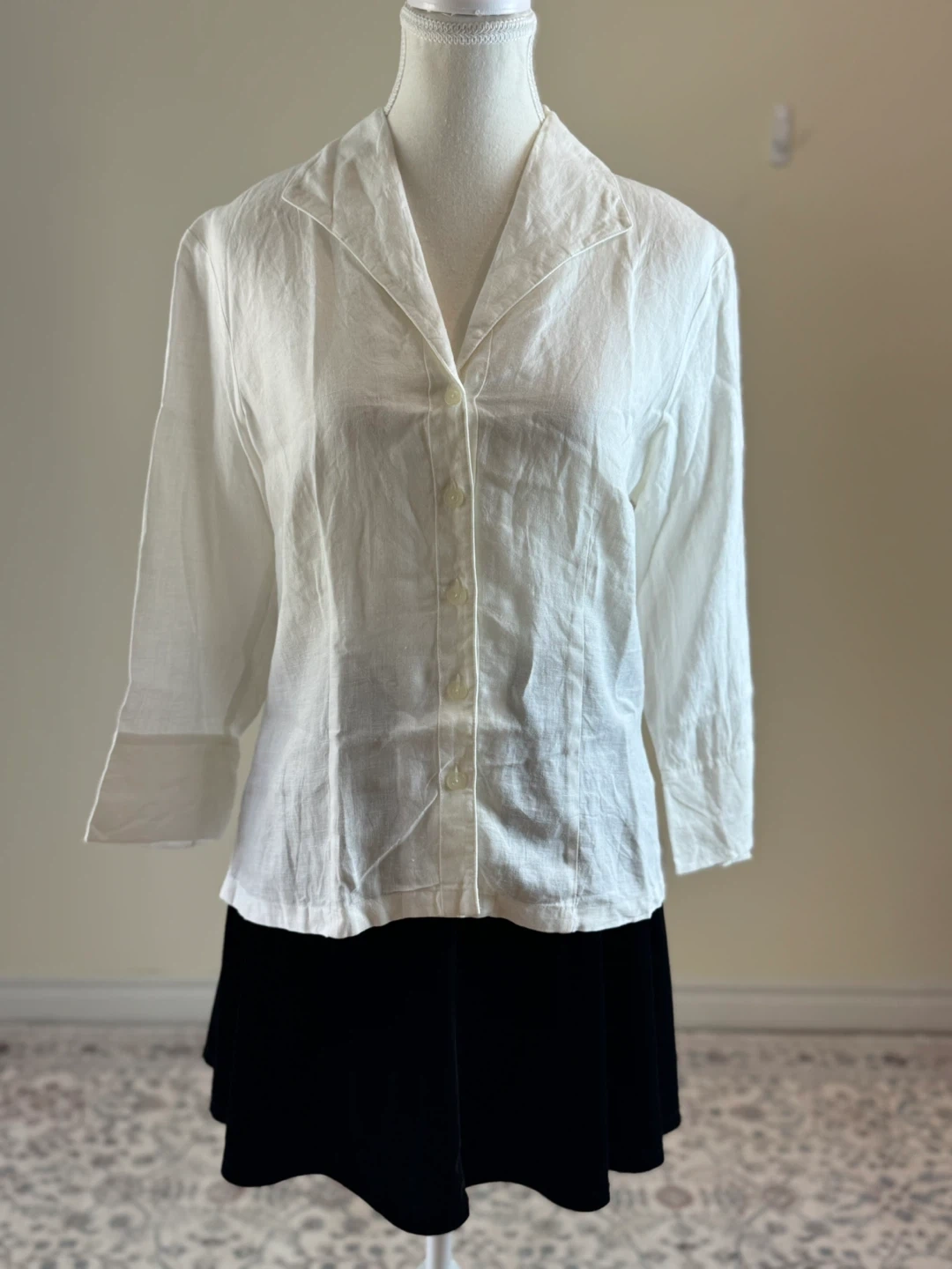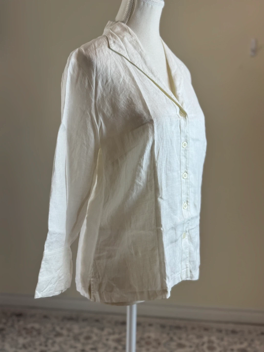 A classic Talbots Petites blouse crafted from 100% Irish linen, offering breathable comfort and timeless sophistication. Designed with a notched collar, button-front closure, and tailored fit, this versatile top transitions seamlessly from office wear to casual weekend looks. The natural linen fabric drapes beautifully, making it a perfect piece for summer layering or minimalist workwear style.