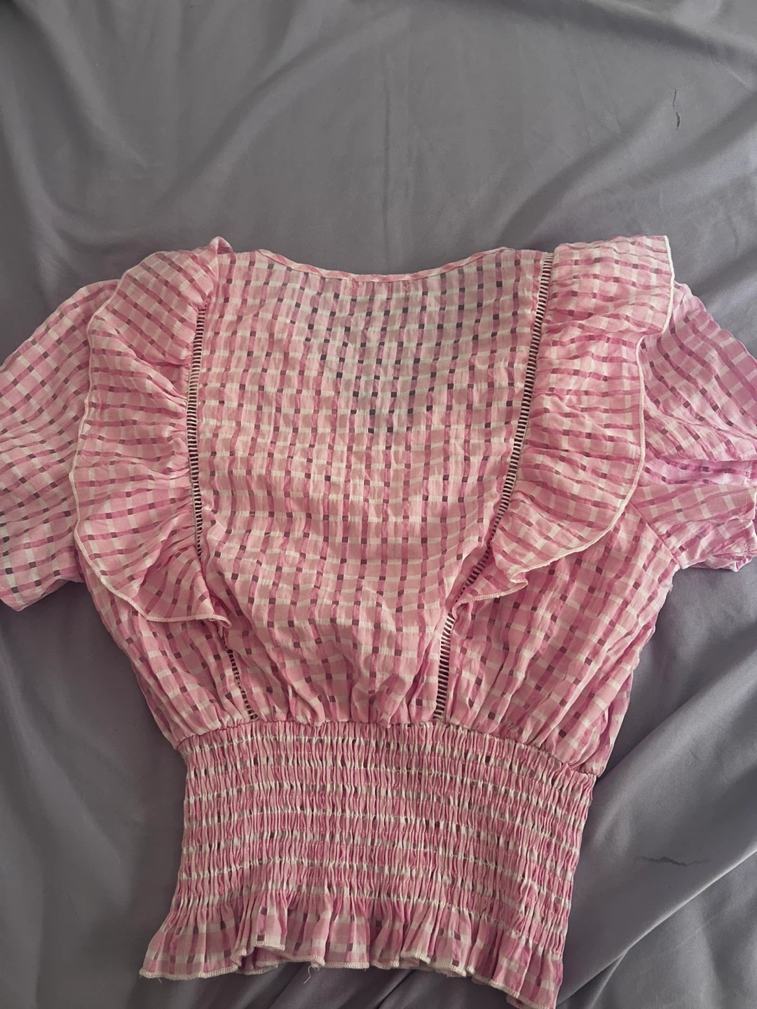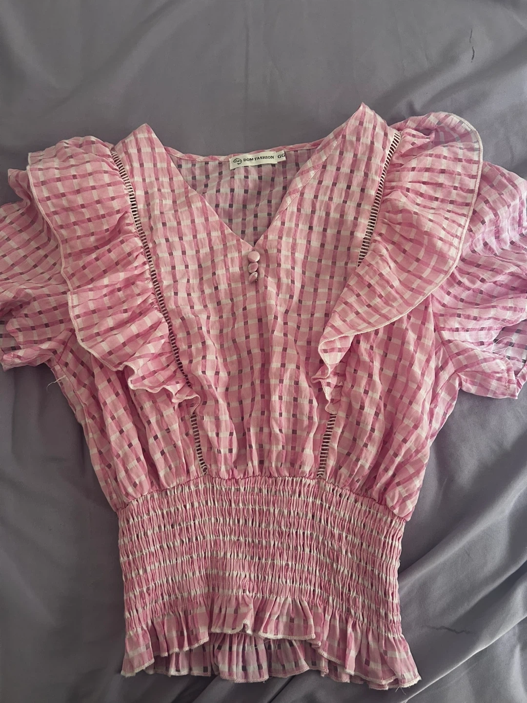 10Here's a cute Rose Fashion blouse in a pink checkered pattern! It's a size OS (One Size) and features a flattering smocked waist and ruffled detailing. Perfect for adding a touch of sweetness to your wardrobe!