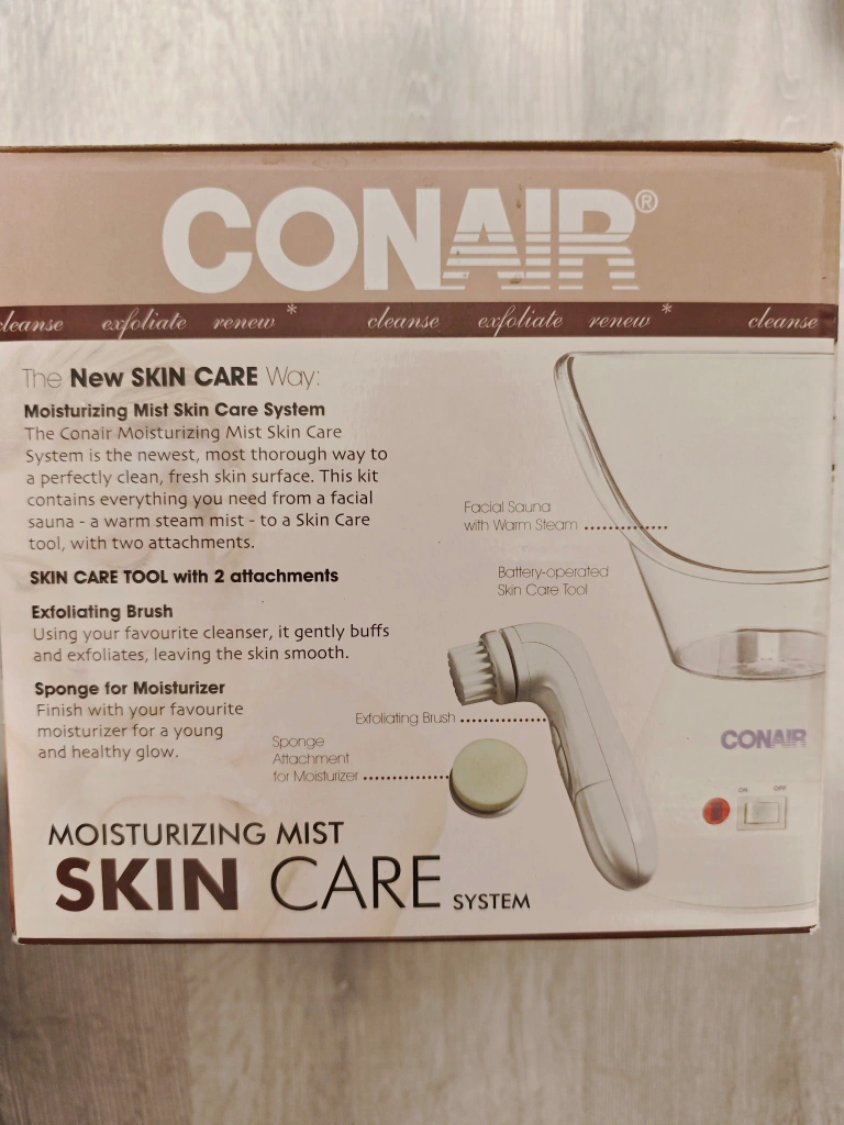 Selling a brand new Conair Moisturizing Mist Skin Care System! It's the new way to care for your skin, with a warm facial sauna that cleanses pores. It also comes with two attachments for exfoliating skin and applying lotion. The kit includes everything you need for a perfectly clean and fresh skin surface, including a facial sauna with warm steam and two attachments. You also get an exfoliating brush and a sponge for moisturizer