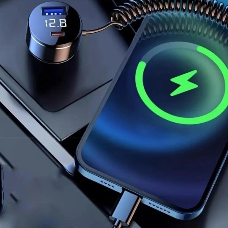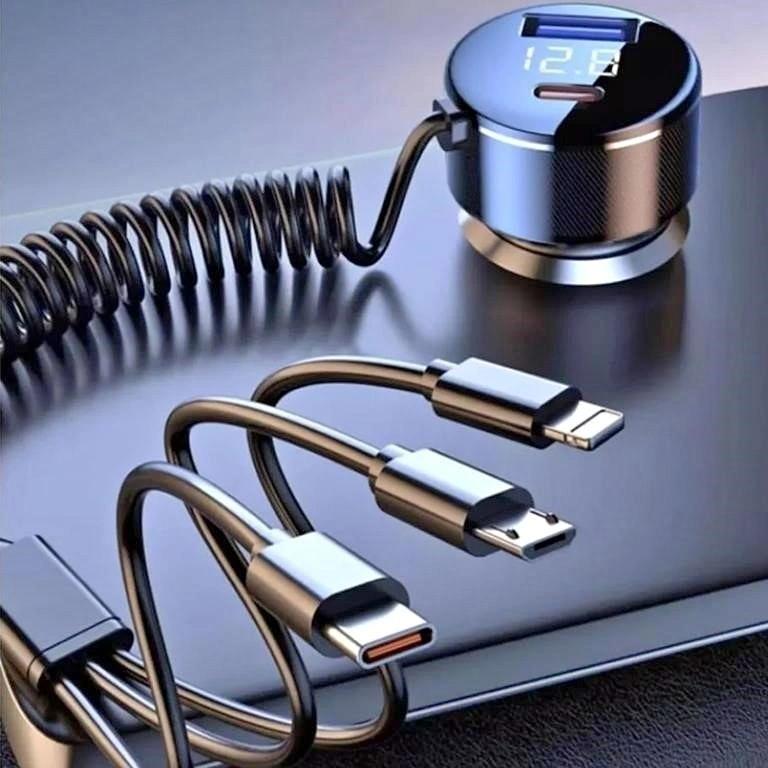 Brand New Car Charger with LED Display. Built in 3 cables With QC3.0 Fast charge USB A port with Type PD 30W fast charge port Can support 5 devices working simultaneously With LED Voltage display.