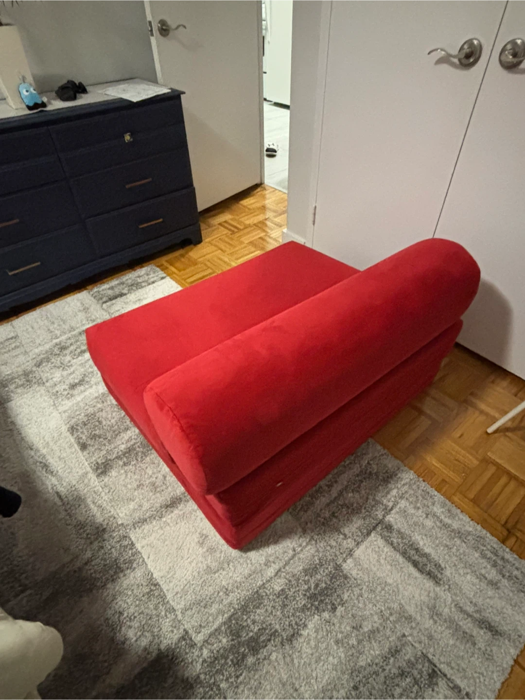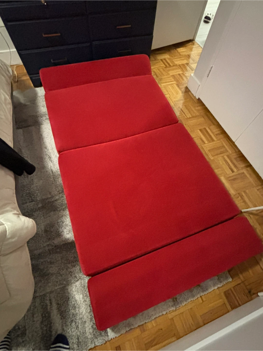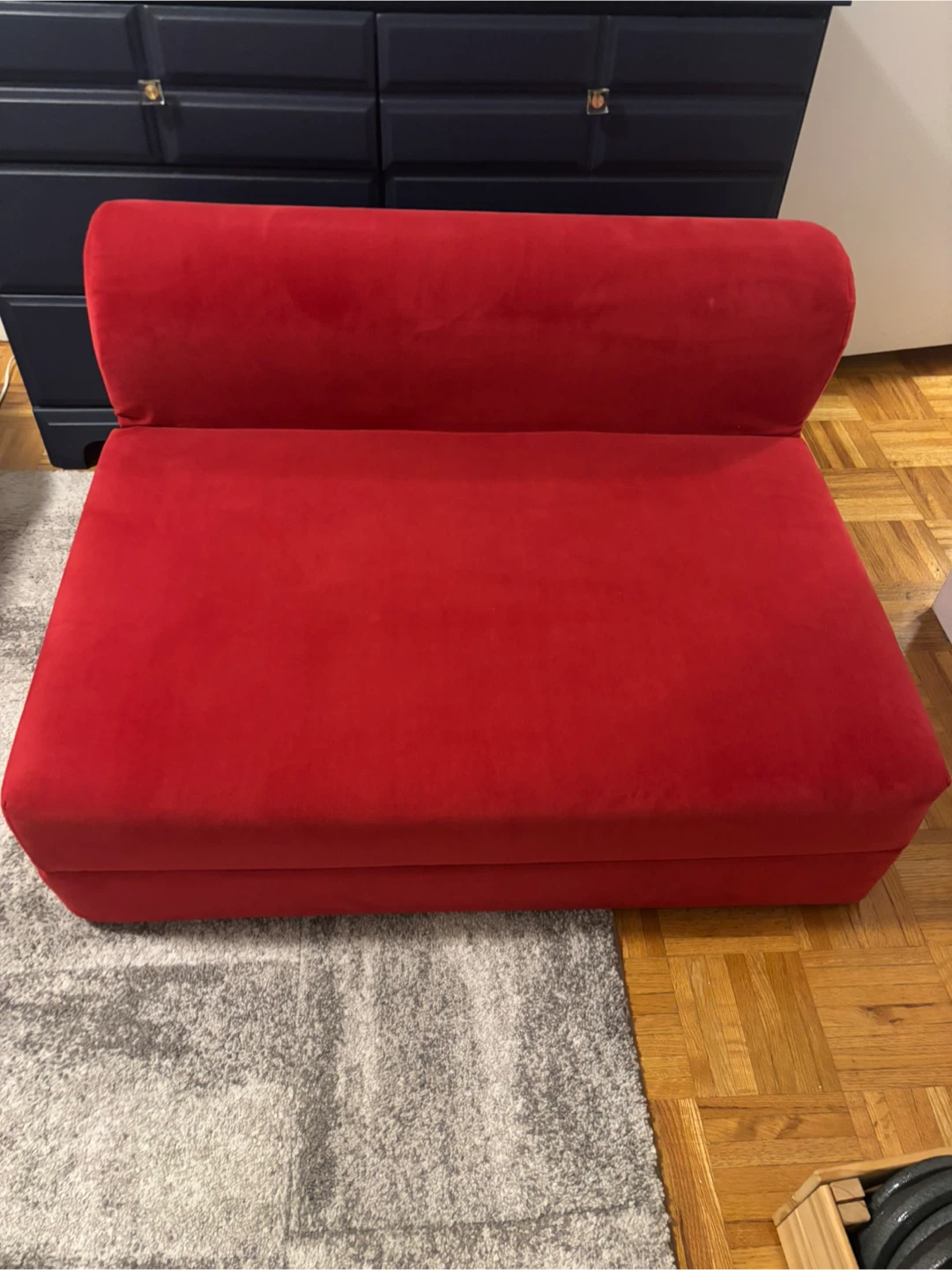 Red sleeper chair bed in good condition! This versatile piece can be used as a chair or unfolded into a bed. Perfect for small spaces or guest rooms. It's lightweight and portable, making it easy to move around as needed