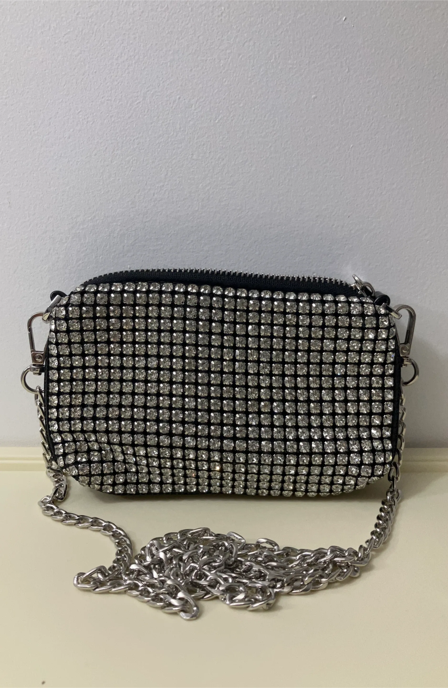 Sparkly rhinestone clutch with a silver chain strap! Perfect for a night out or special occasion. It's in great condition and ready for a new home.