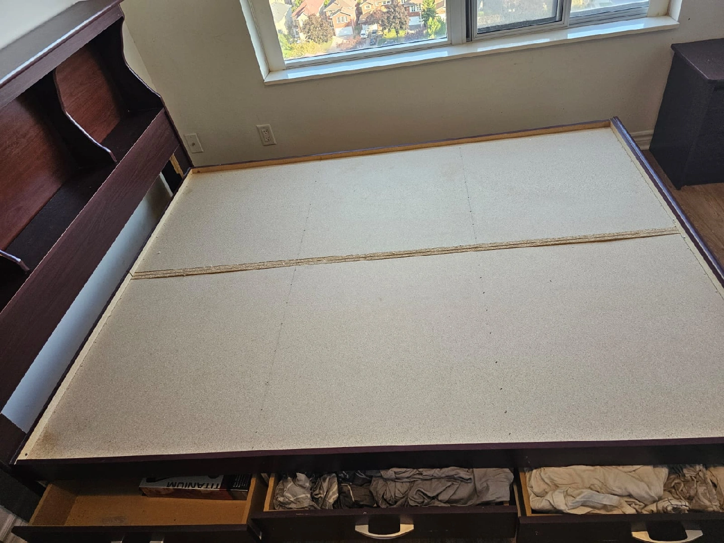 Selling a bed frame that comes with built-in storage drawers. It's in good condition and ready for a new home!