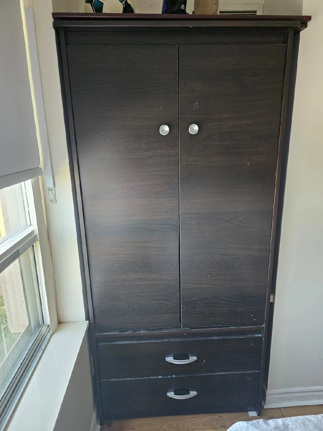 Selling a dark brown wardrobe with two doors and two drawers. It's perfect for adding extra storage space to any room. The unit is in good condition and ready for a new home! A few minor scratches are visible.