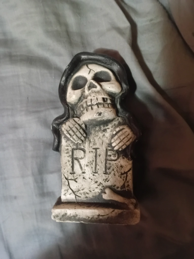 Selling a spooky figurine of a grim reaper emerging from a tombstone marked 'RIP'! Perfect for Halloween decor or anyone who loves a bit of the macabre