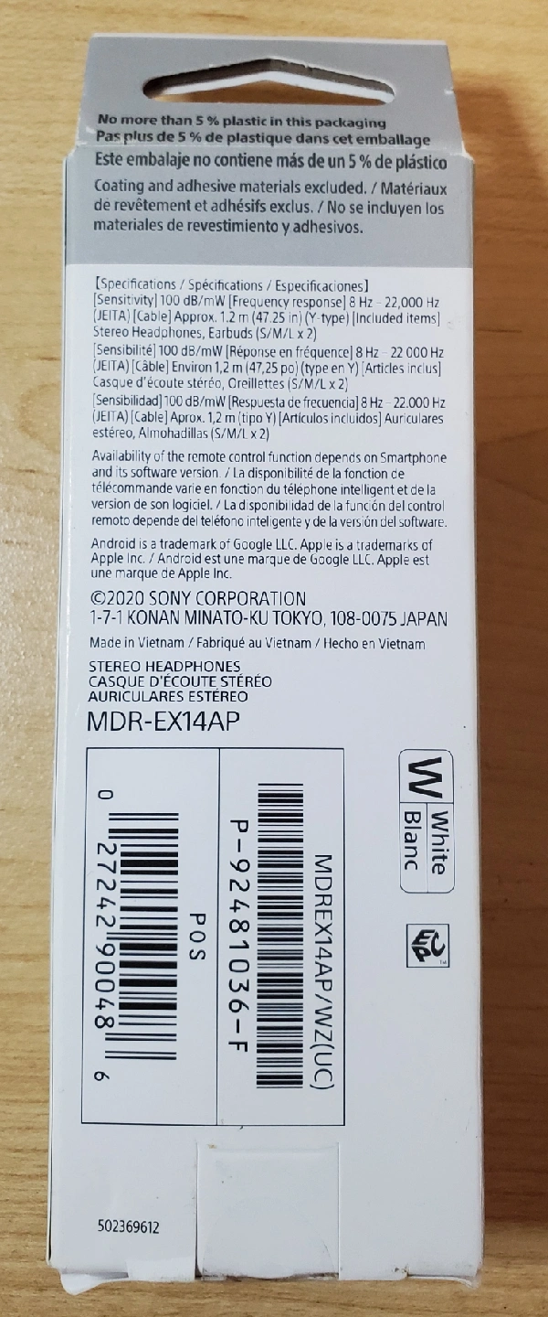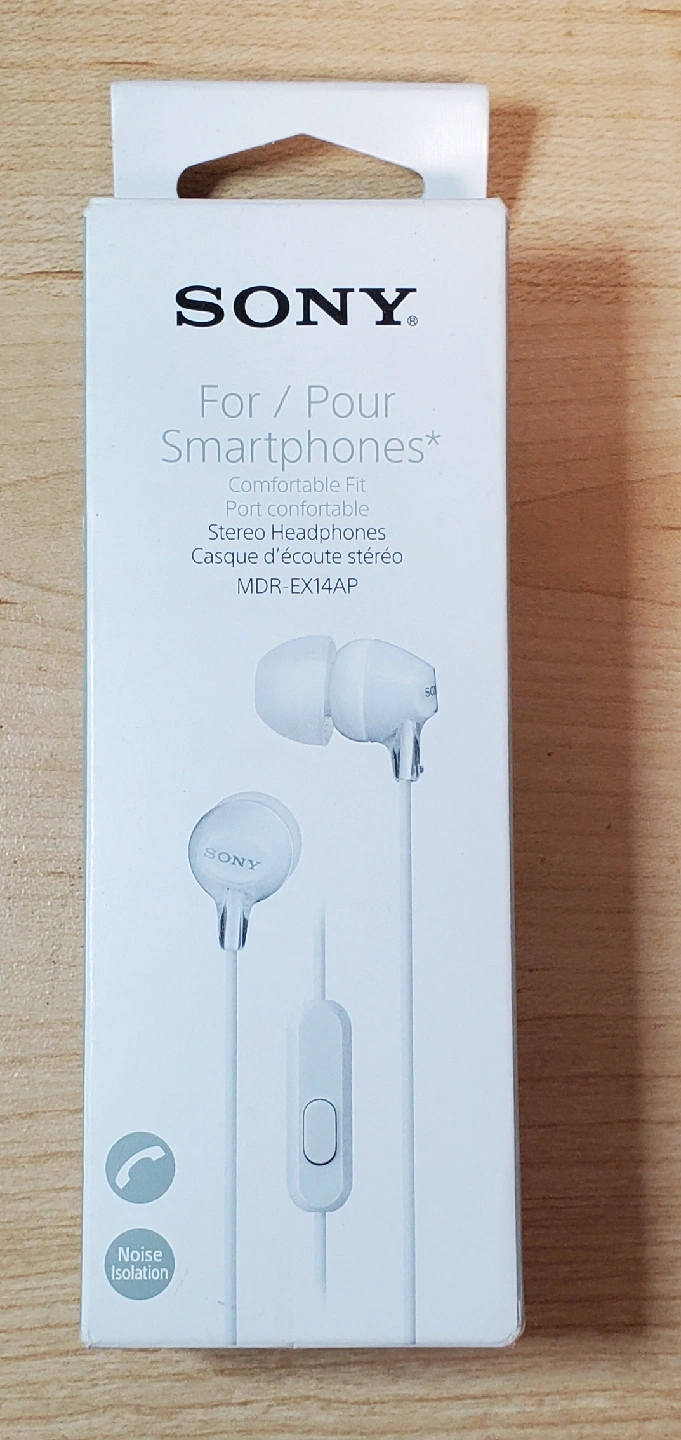 22Selling a brand new pair of Sony MDR-EX14AP stereo headphones in white! These comfortable fit, noise isolating headphones are still in their original packaging. Perfect for smartphones with a tangle-free serrated cable and hands-free phone calls